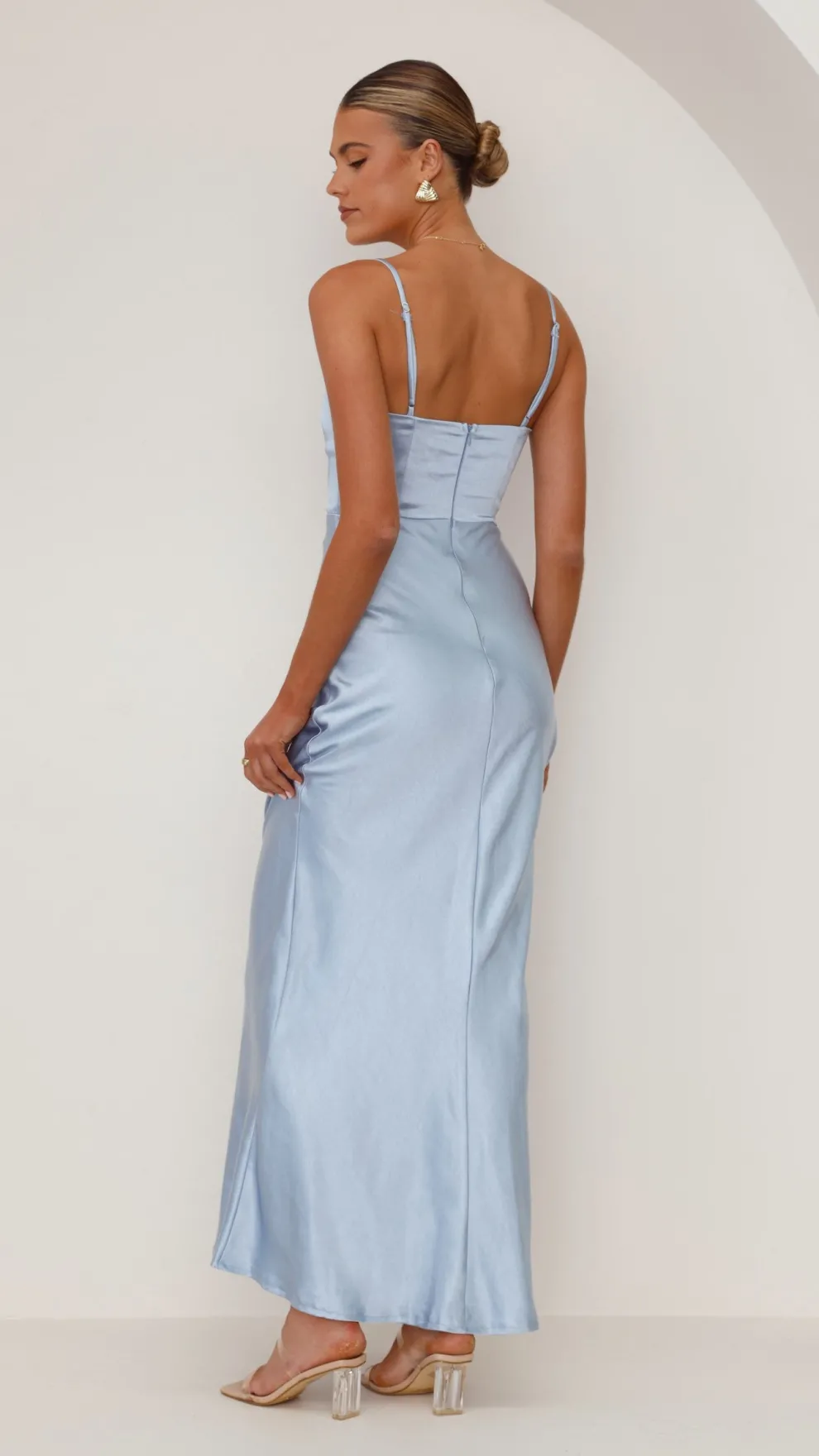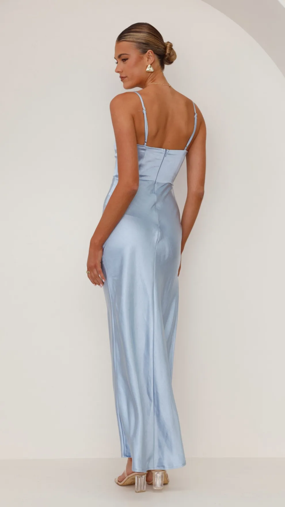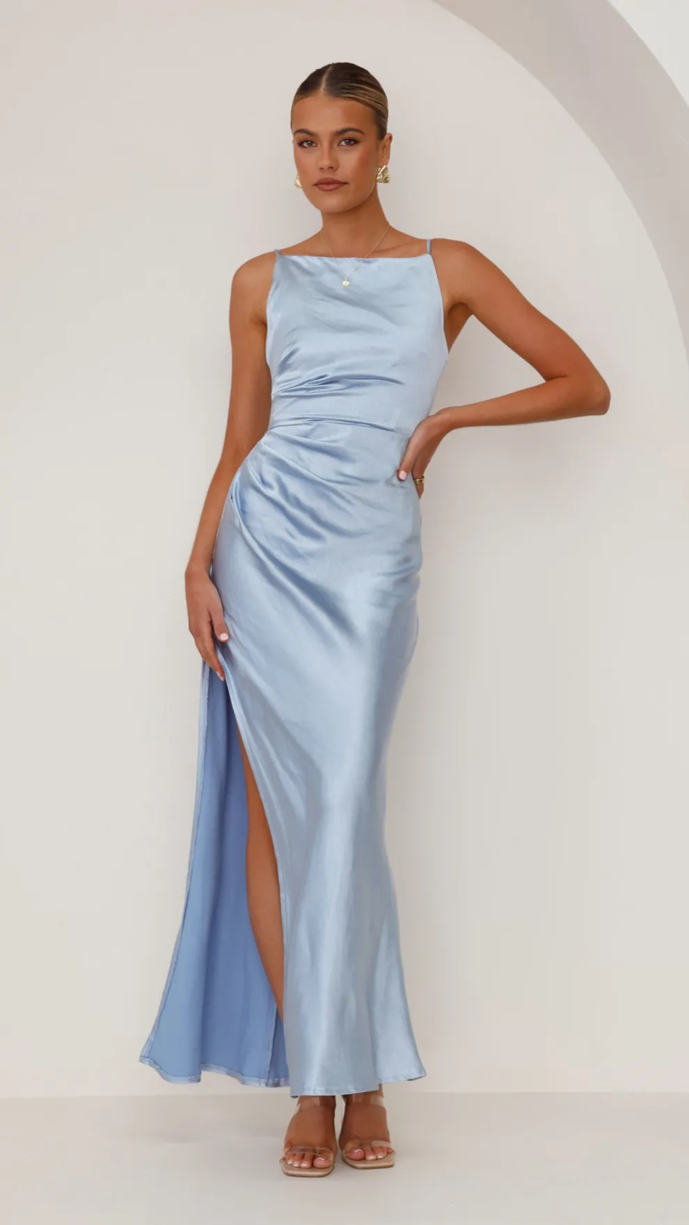 Featuring a stunning, elegant square neckline, the Ava Maxi Dress – Blue adds a touch of sophistication to any occasion. Its classy side split adds a modern twist to this timeless design. Elevate your style game with this dress that exudes both grace and confidence.