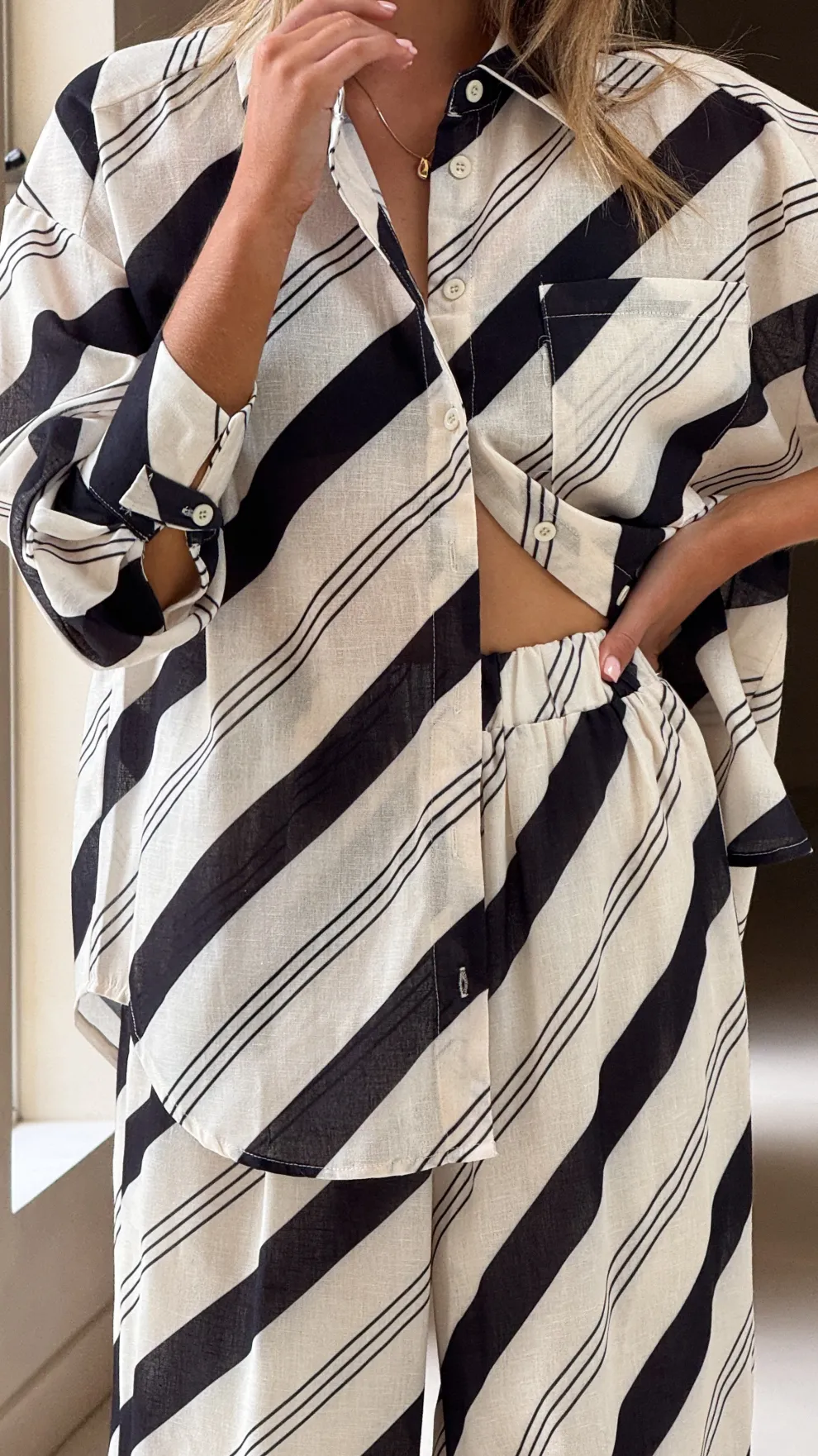Get the look! Torrey Wide Leg Pants – Black/Cream & Amylee Slide – Black