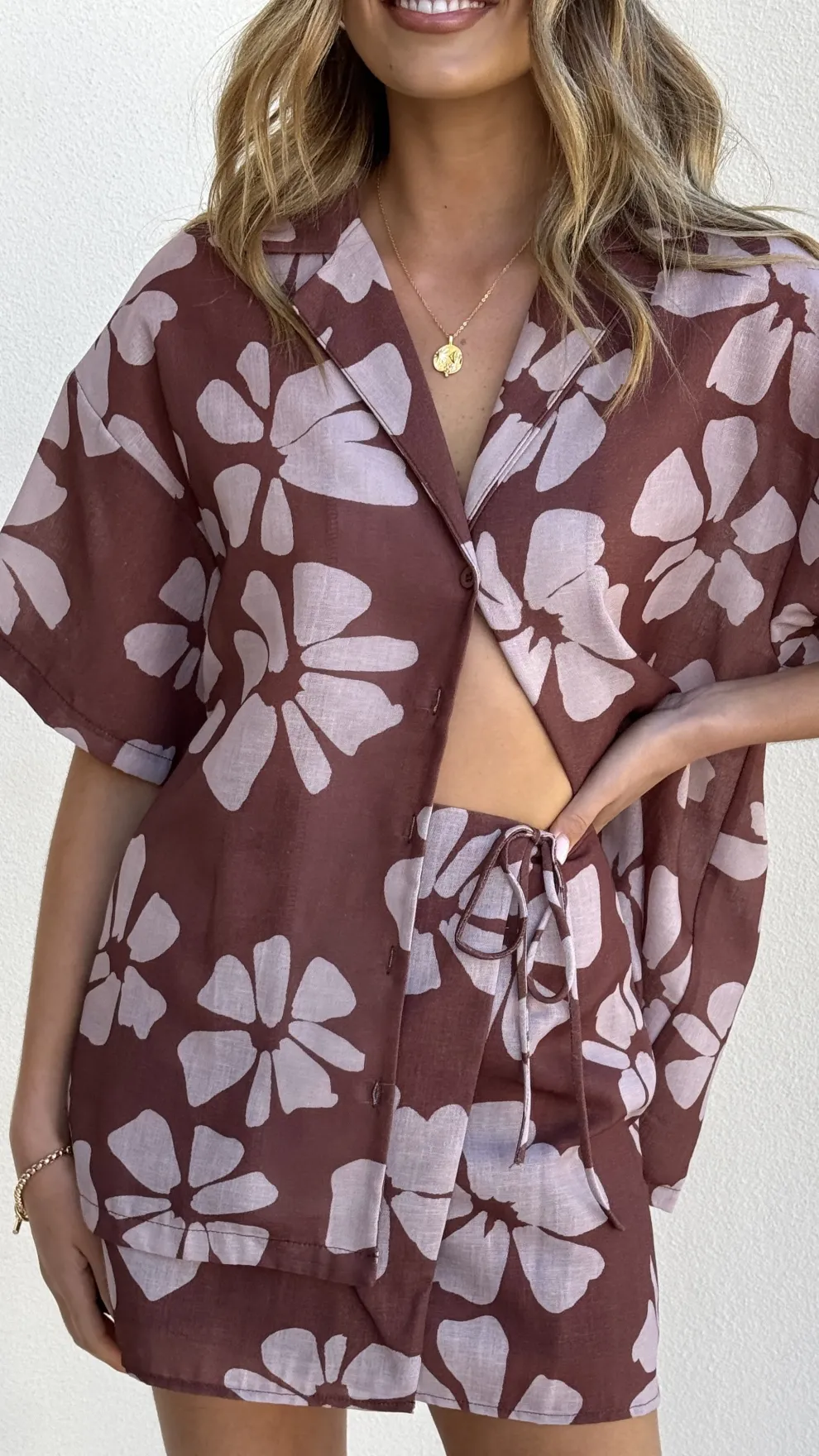 Get the look! Abilene Button Up Shirt – Brown Daylillies & Xami Heel – White