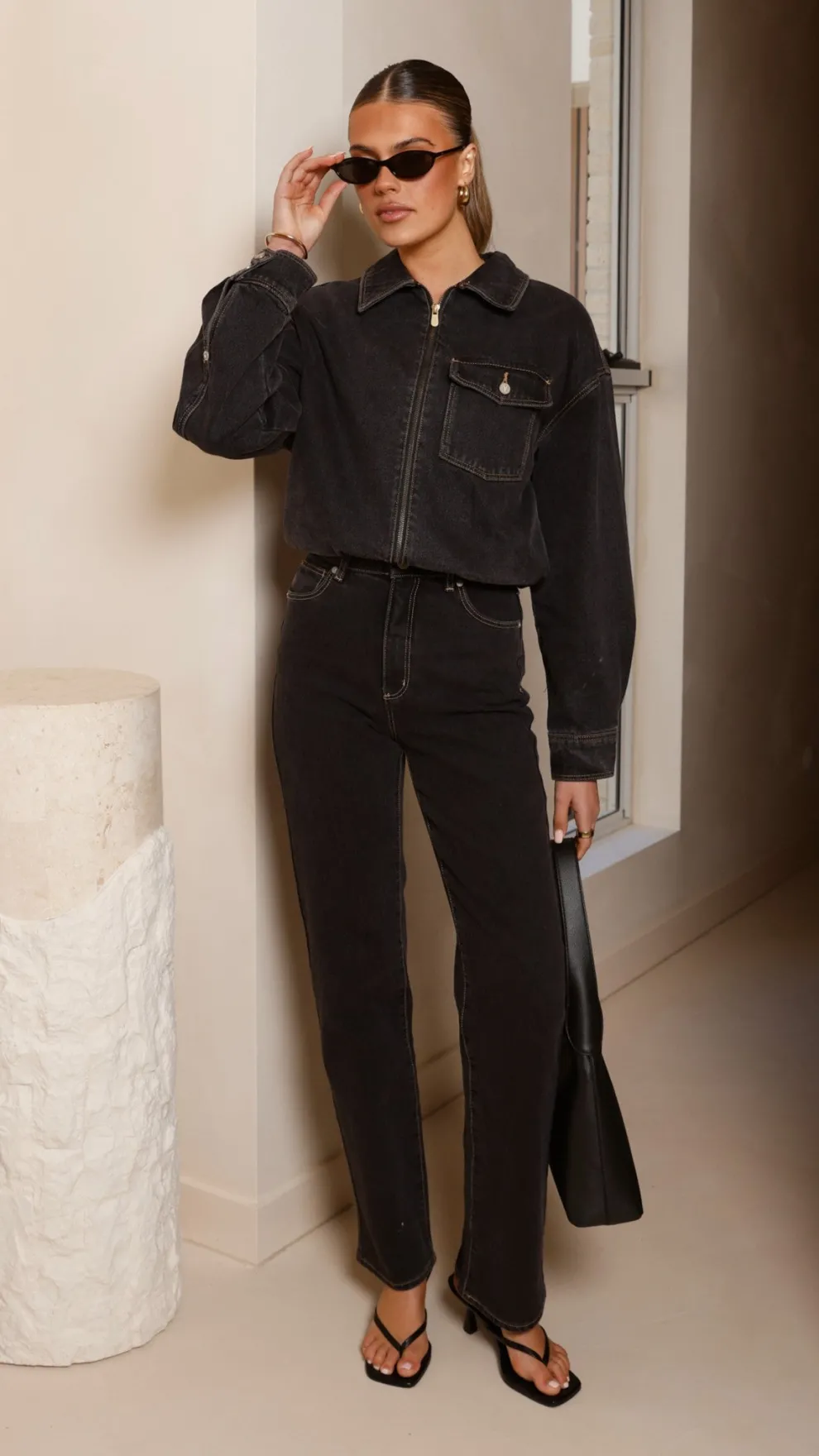 Get the look! Yahara Heel – Black & Abrand Denim Bomber Cara – Washed Black