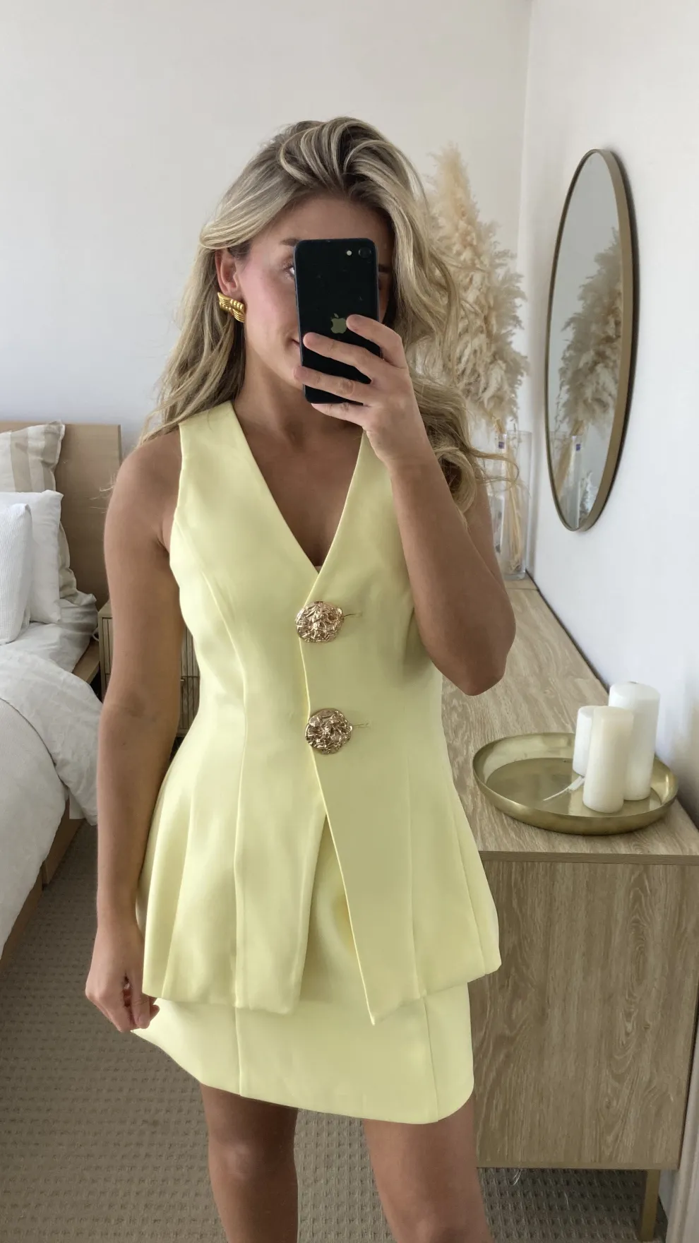 Get the look! Rylie Mini Skirt – Lemon, Monroe Handle Bag – Bone & Kendra Heel – White Shine