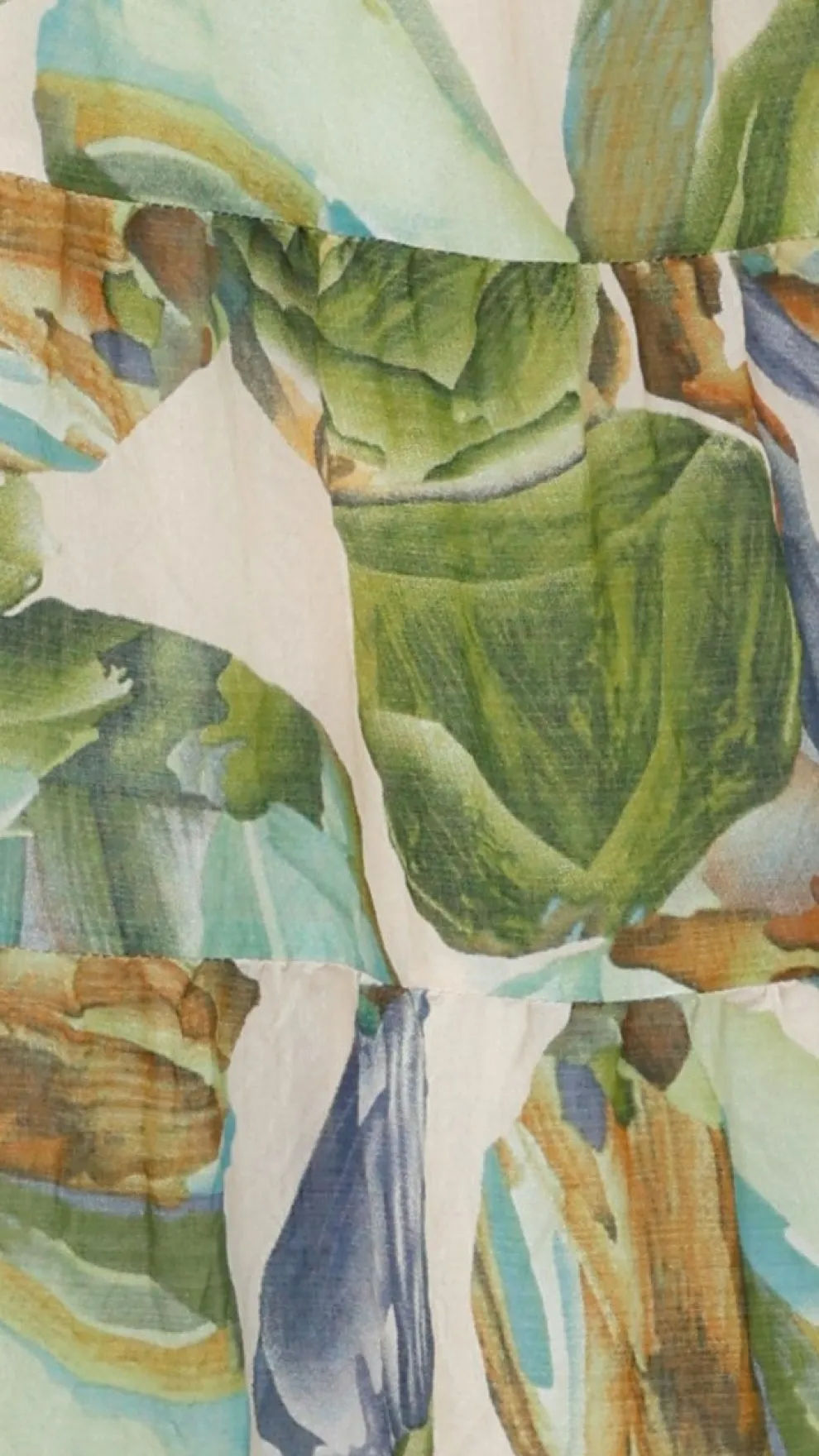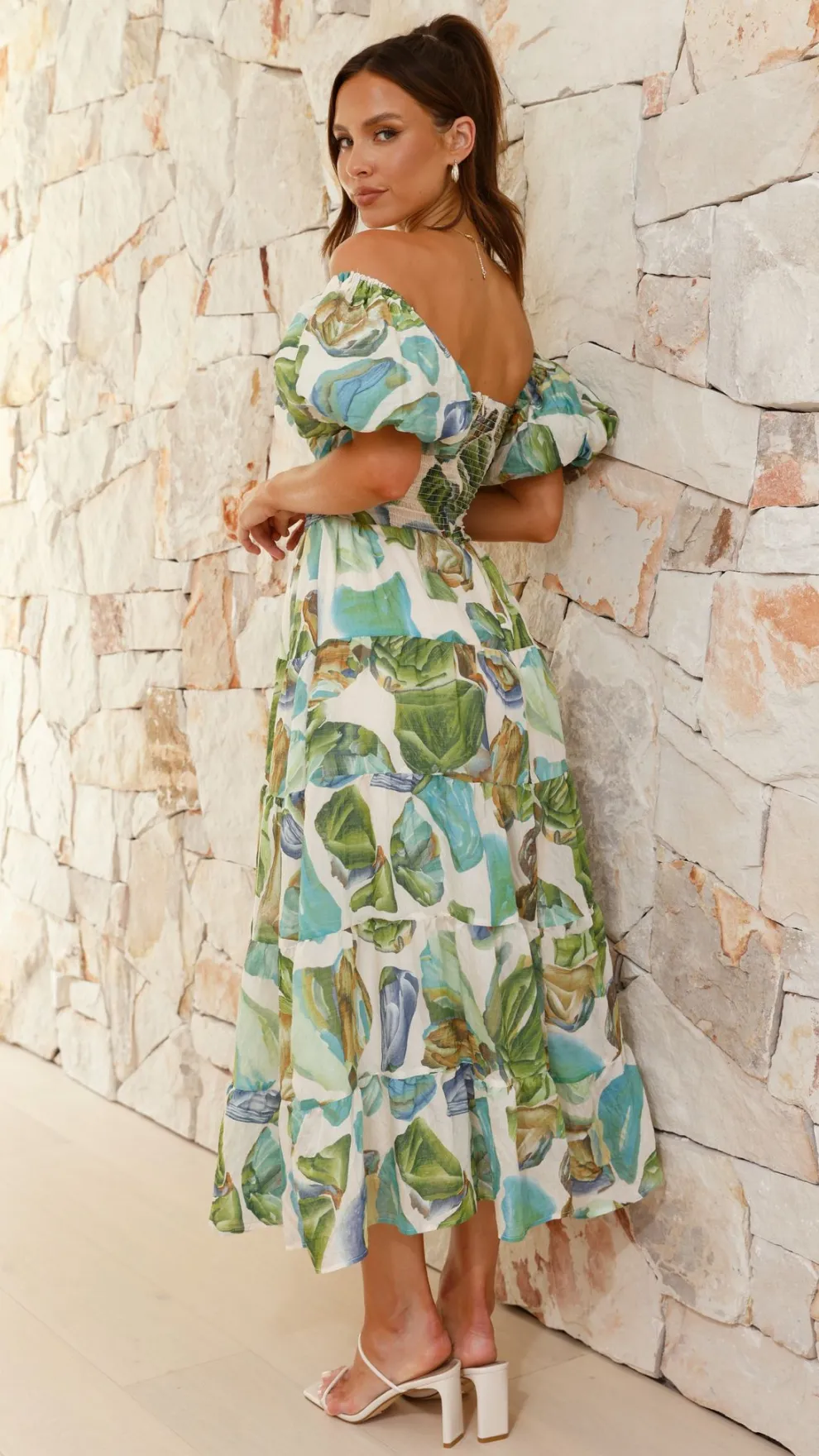 Elevate your style with the Balthazar Maxi Dress in a striking green and blue print. Featuring elasticated puff sleeves and a versatile twist front design, this dress can be worn on or off the shoulder for effortless elegance. The front cutout adds a subtle allure, while the invisible back zip with shirred panel ensures a comfortable fit. Its maxi length and tiered skirt detailing create a graceful silhouette perfect for any occasion. Embrace both comfort and sophistication in this standout piece.