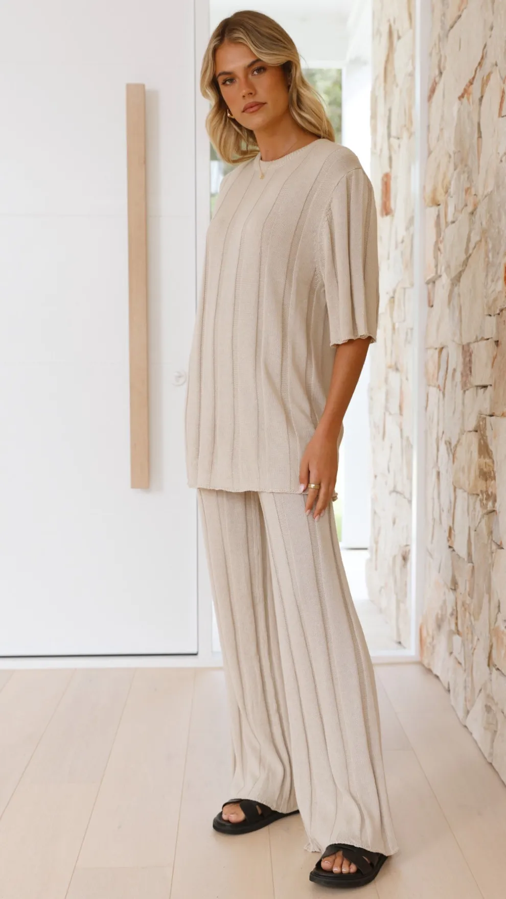 Get the look! Bayu Knit Pants – Cream & Zanna Slide – Black