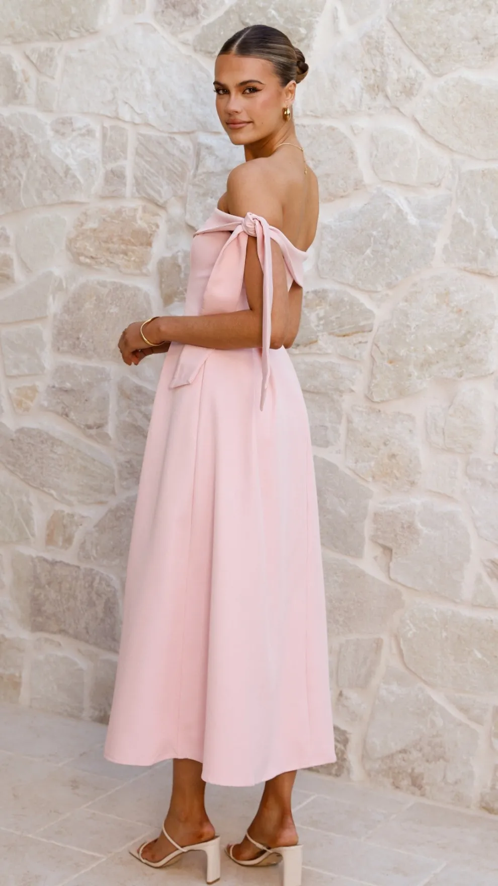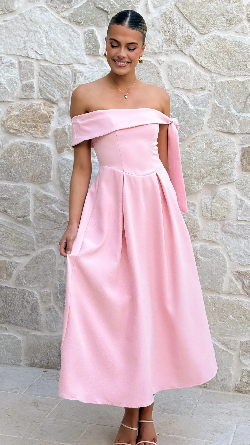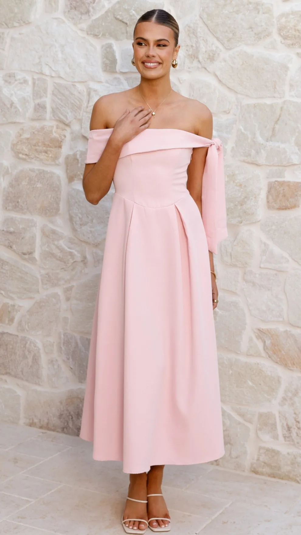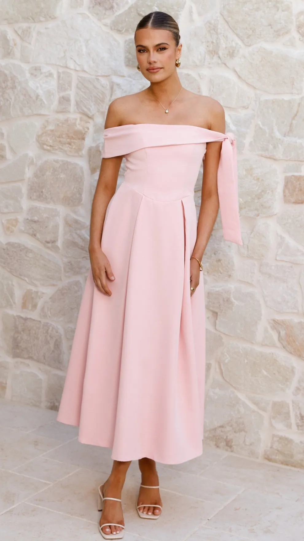 This elegant midi dress features an off-shoulder silhouette with a fold and side tie accent at the bust. It includes a silicone grip strip for secure wear, an invisible zip at the back, and a fully lined maxi-length design.