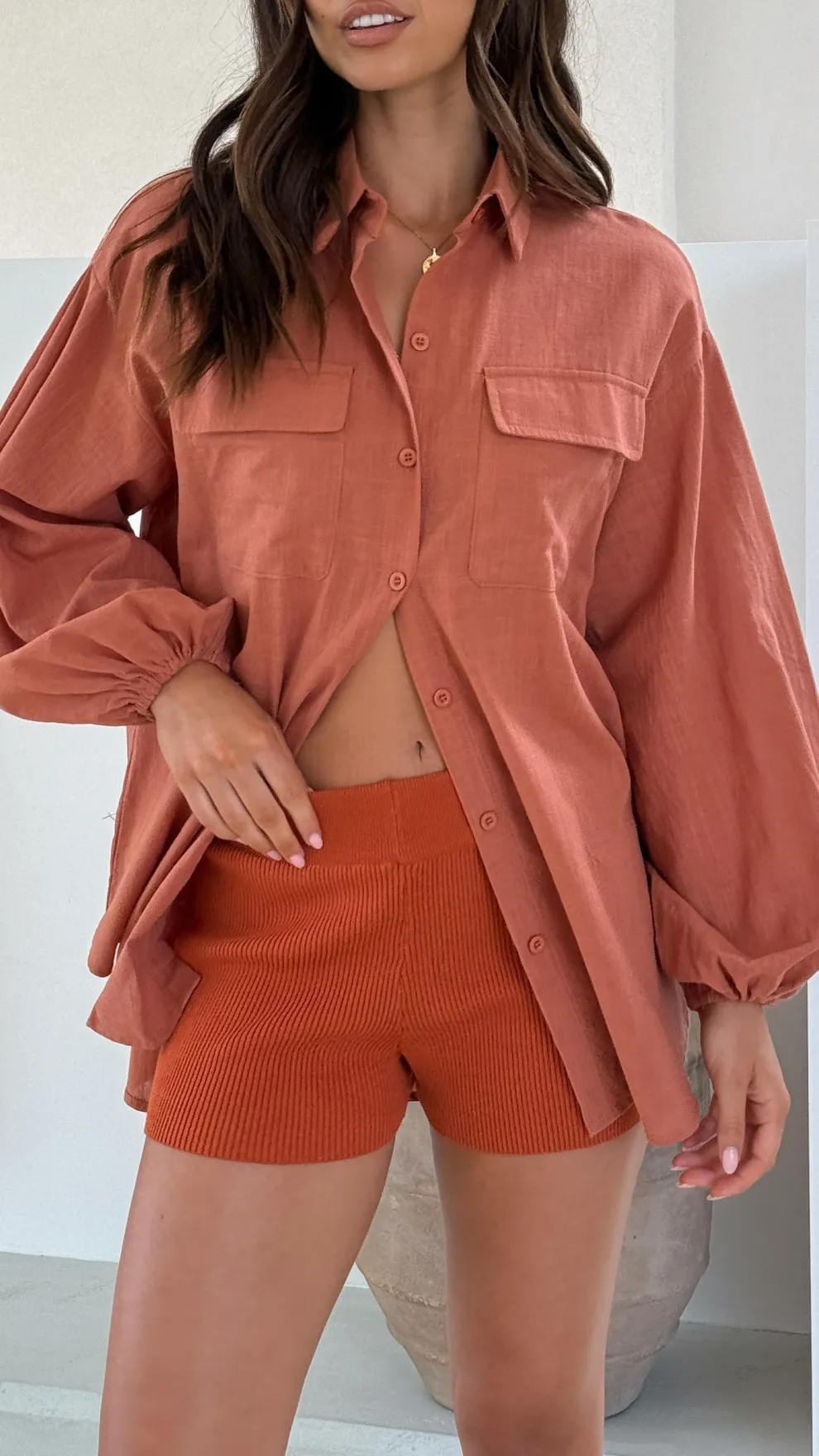 Get the look! Bianca Oversized Button Up Shirt – Rust & Amylee Slide – Bone