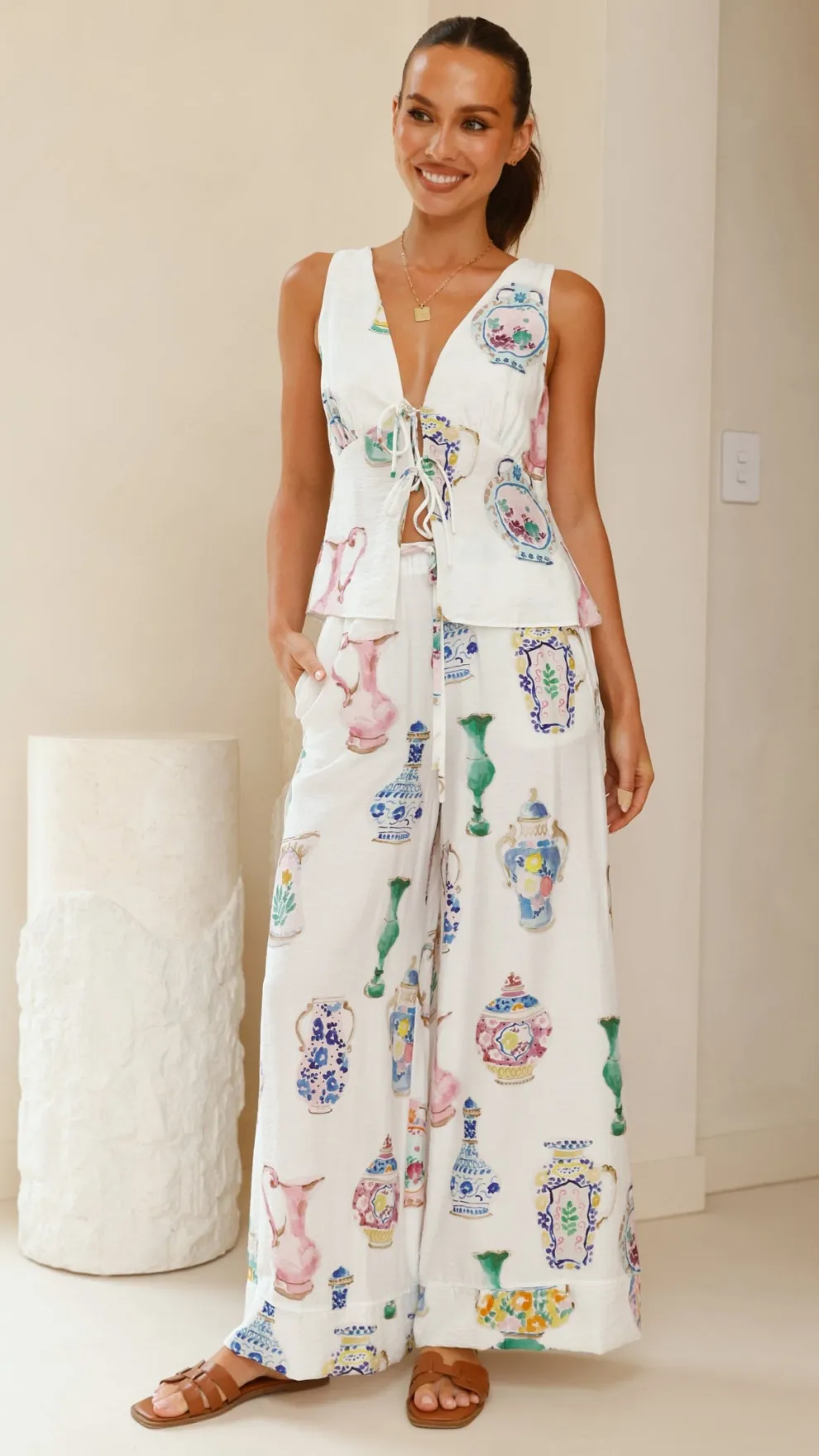 Get the look! Sabin Pants – Vase Print & Pacific Sandals – Sugar Brown