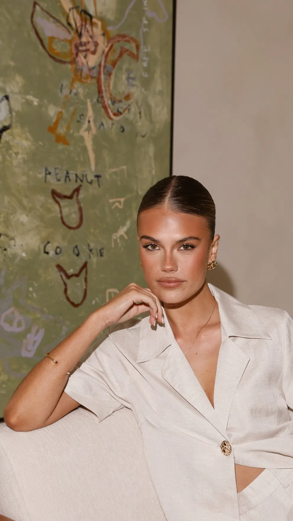 Get the look! Emmaline Button Shirt – Natural & Nyles Heel – Onyx