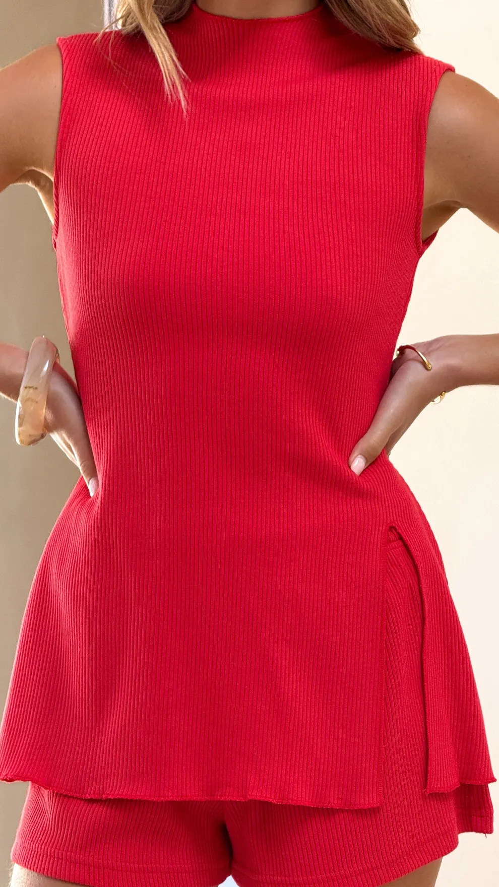 Get the look! Gigi Shorts – Red & Amaya Slide – Clay
