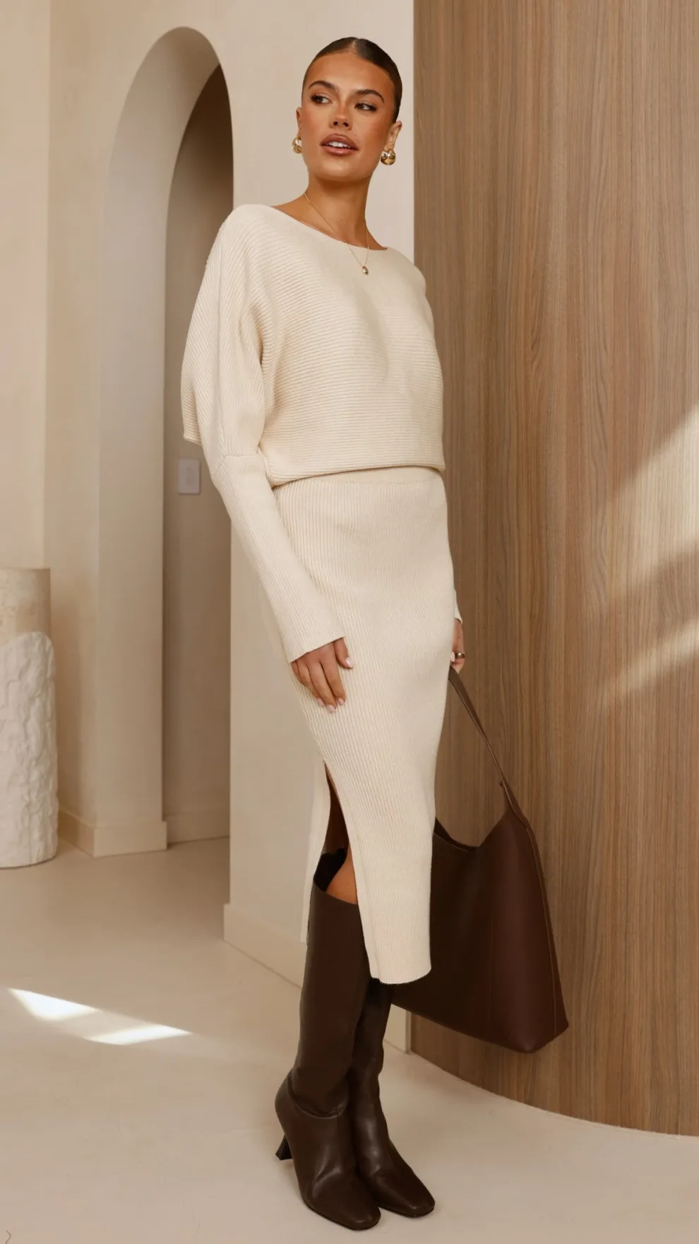 Get the look! Corbin Boot – Black & Iluka Knit Midi Skirt – Beige