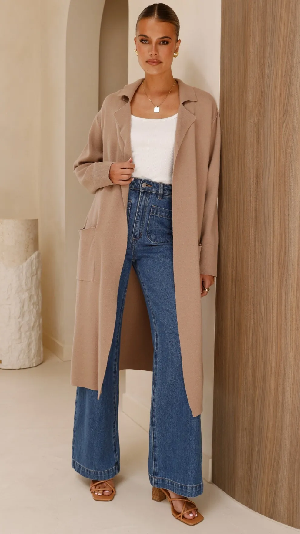 Get the look! Unika Heel – Sugar Brown, Amos Bodysuit – White & Rollas Sailor Jean Long – Ashley Blue