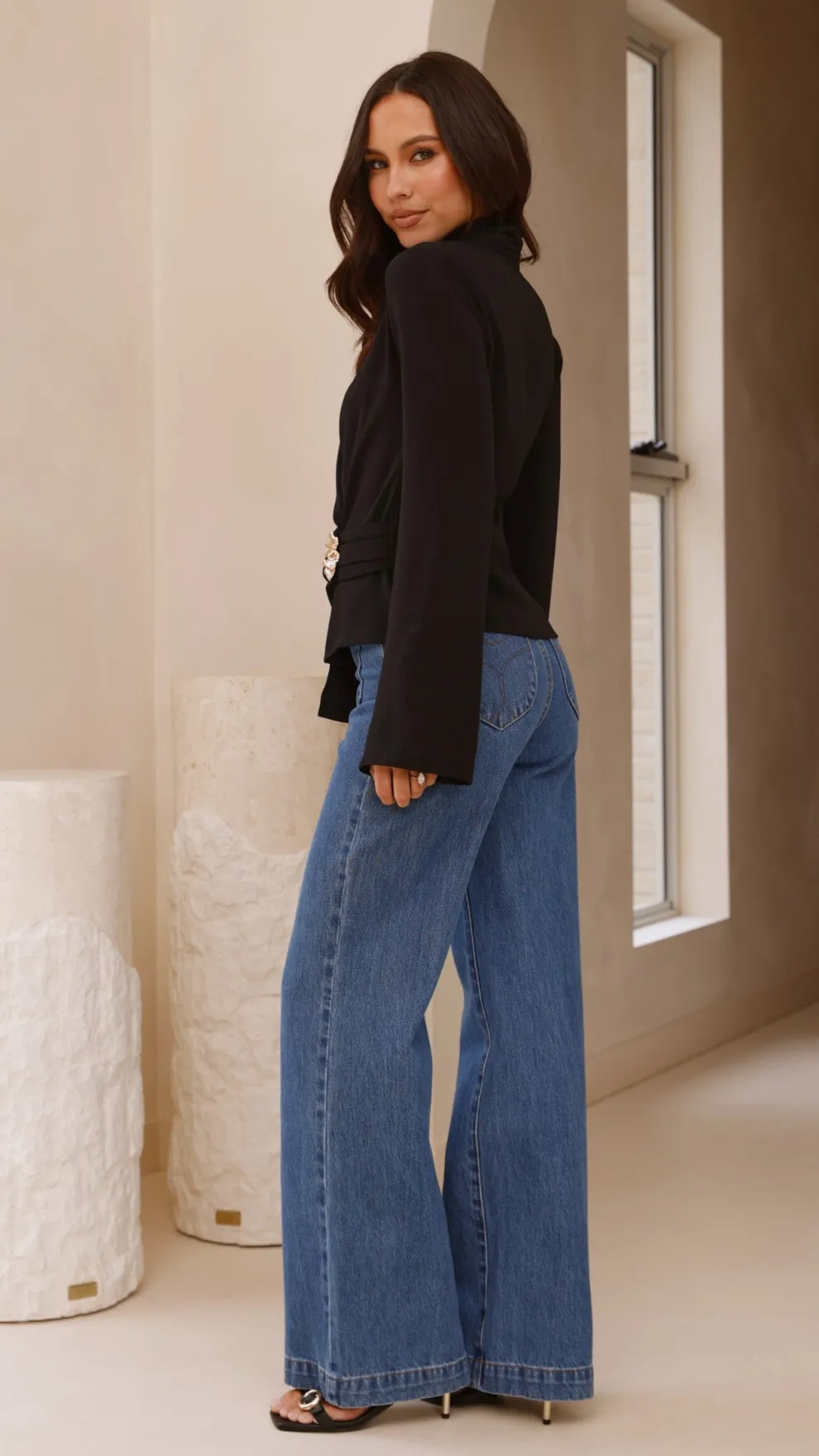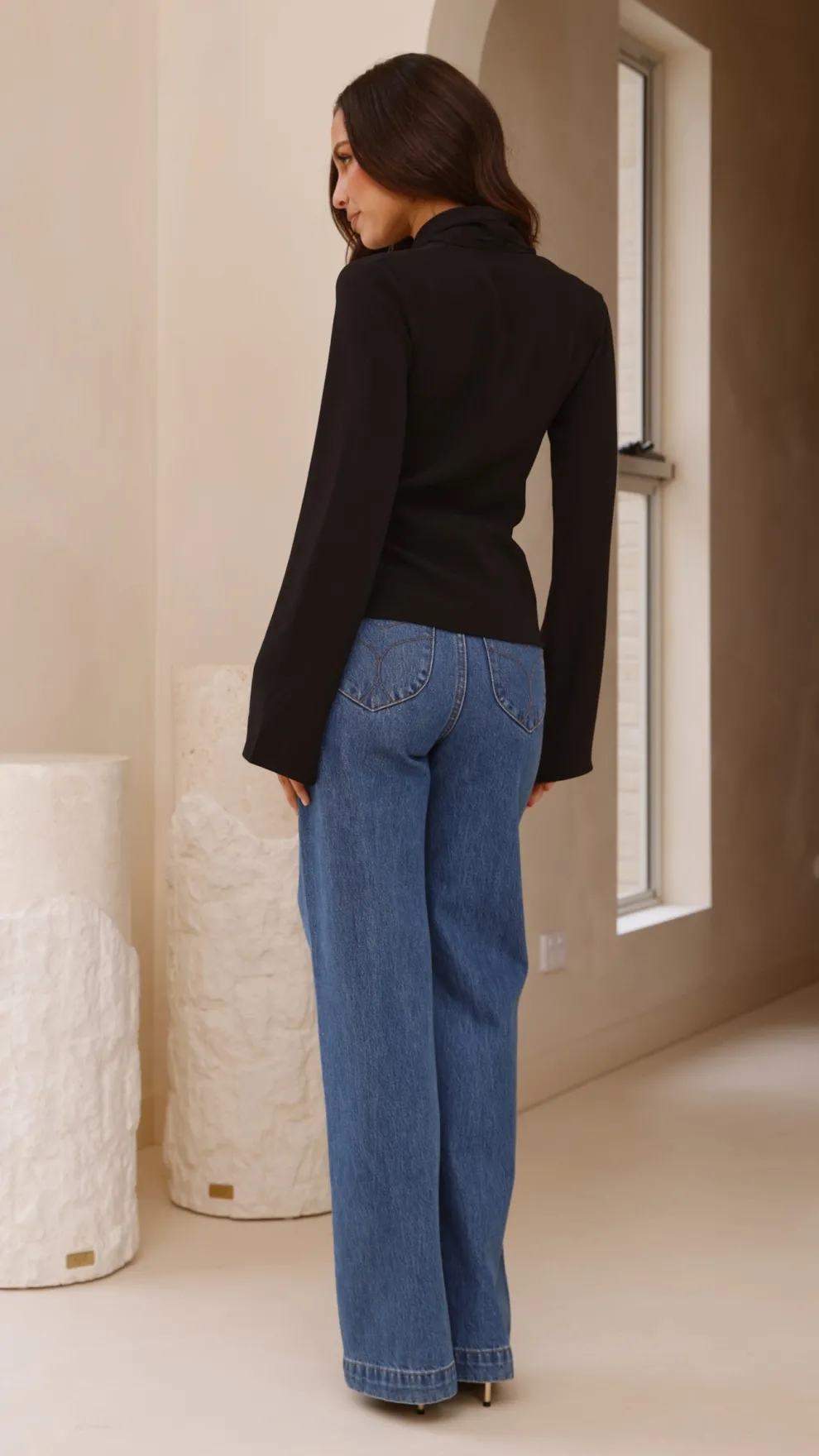Get the look! Rollas Sailor Jean Long – Ashley Blue & Lyon Heel – Black