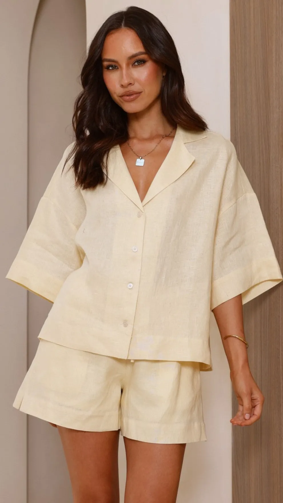 Get the look!Luna Button Up Shirt – Yellow & Yaelle Sandals – Teak