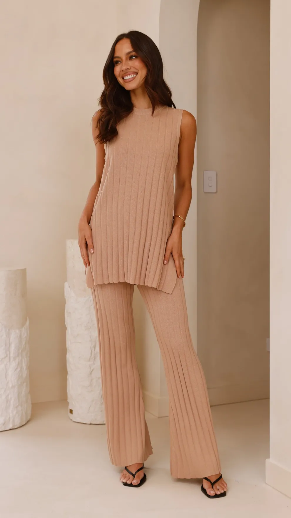 Get the look! Xami Heel – Black & Megan Knit Pants – Camel