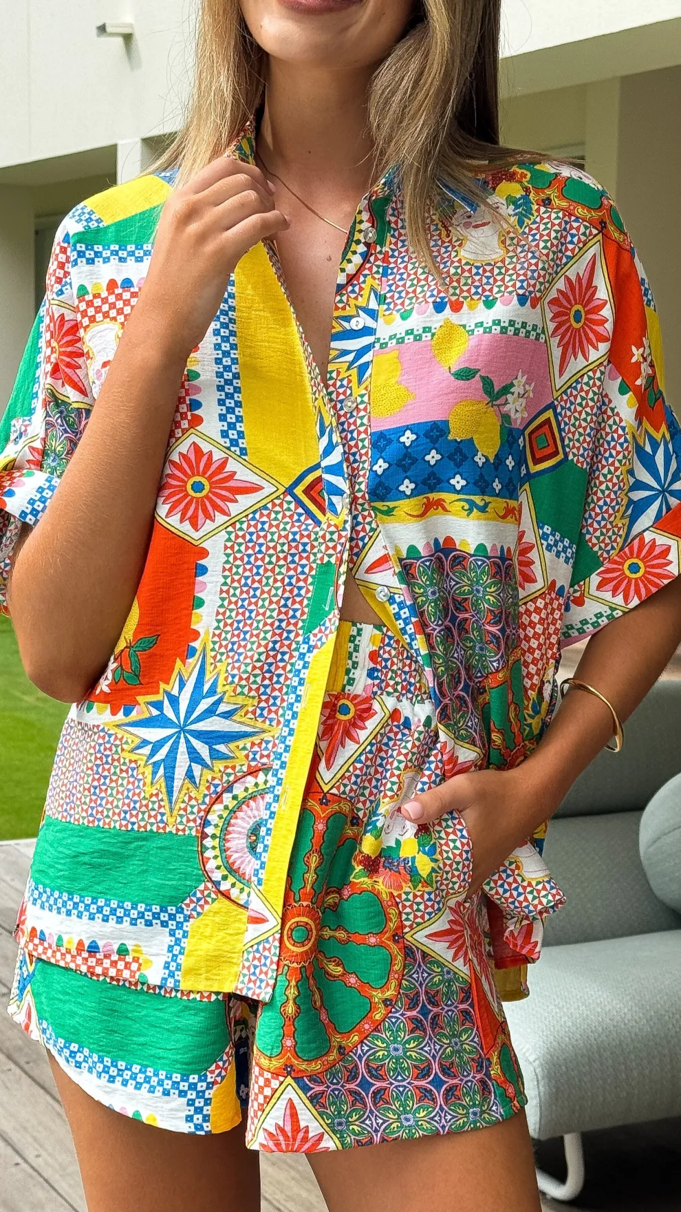 Get the look! Freya Shorts – Dazzle Print & Yaelle Sandals – Teak