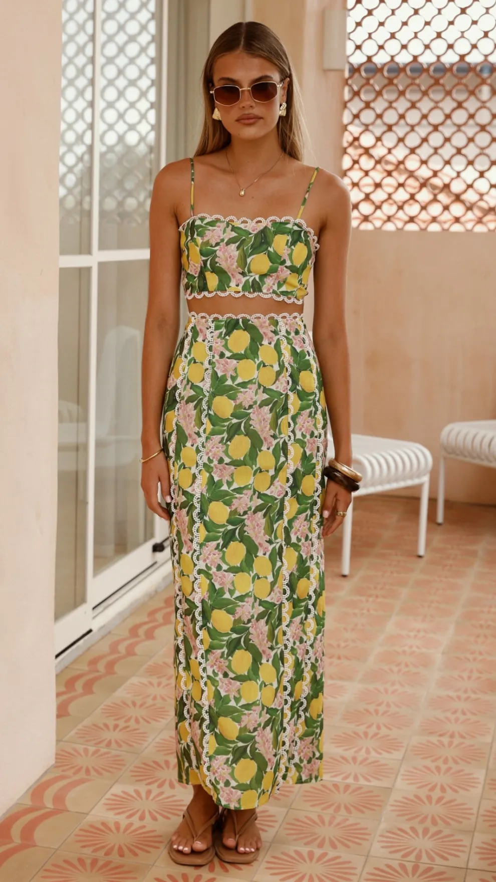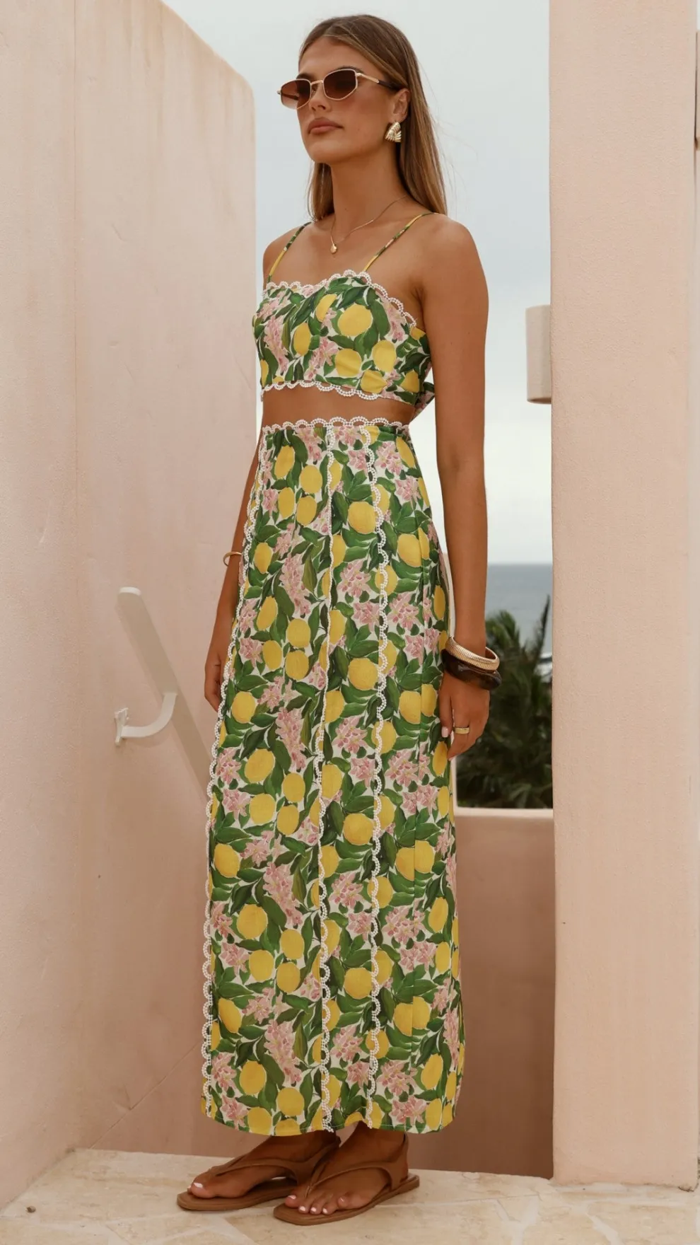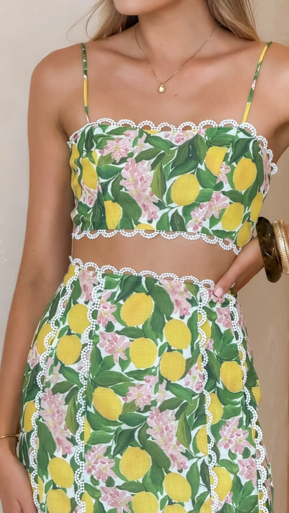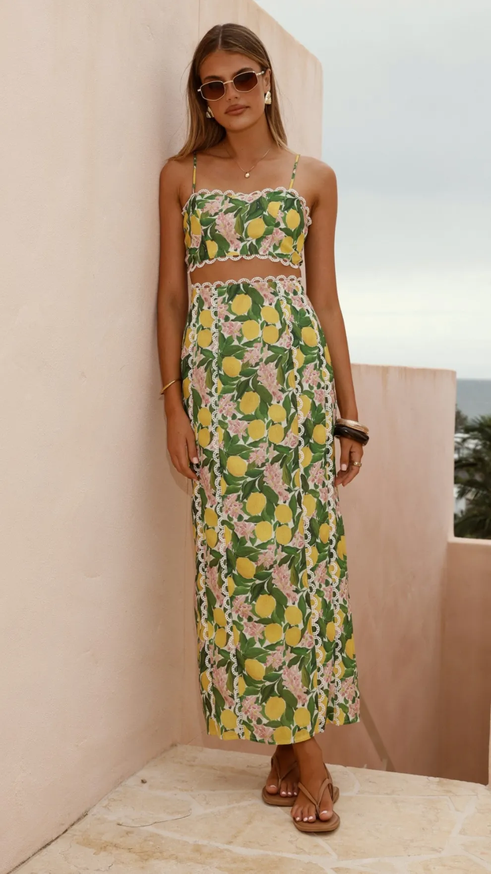 Get the look! Nova Crop Top – Lemon Print & Yaelle Sandals – Teak