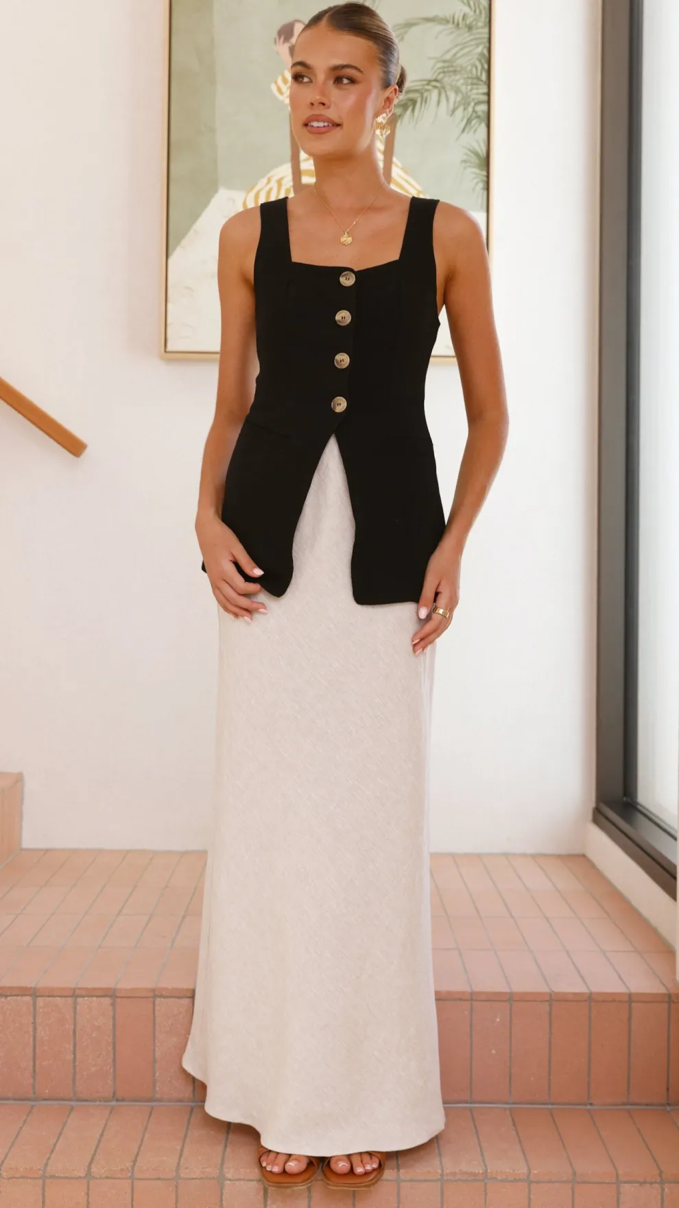 Get the look! Gretal Slide – Tan & Nila Maxi Skirt – Oat