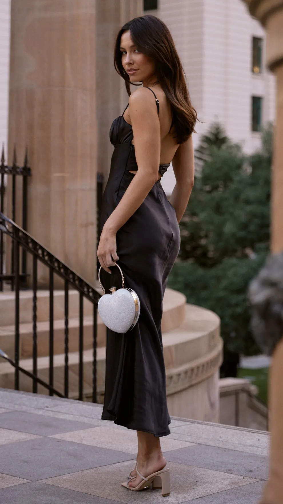 Get the look! Waylen Heel – Bone/Natural & Lacee Bag – Silver / Gold