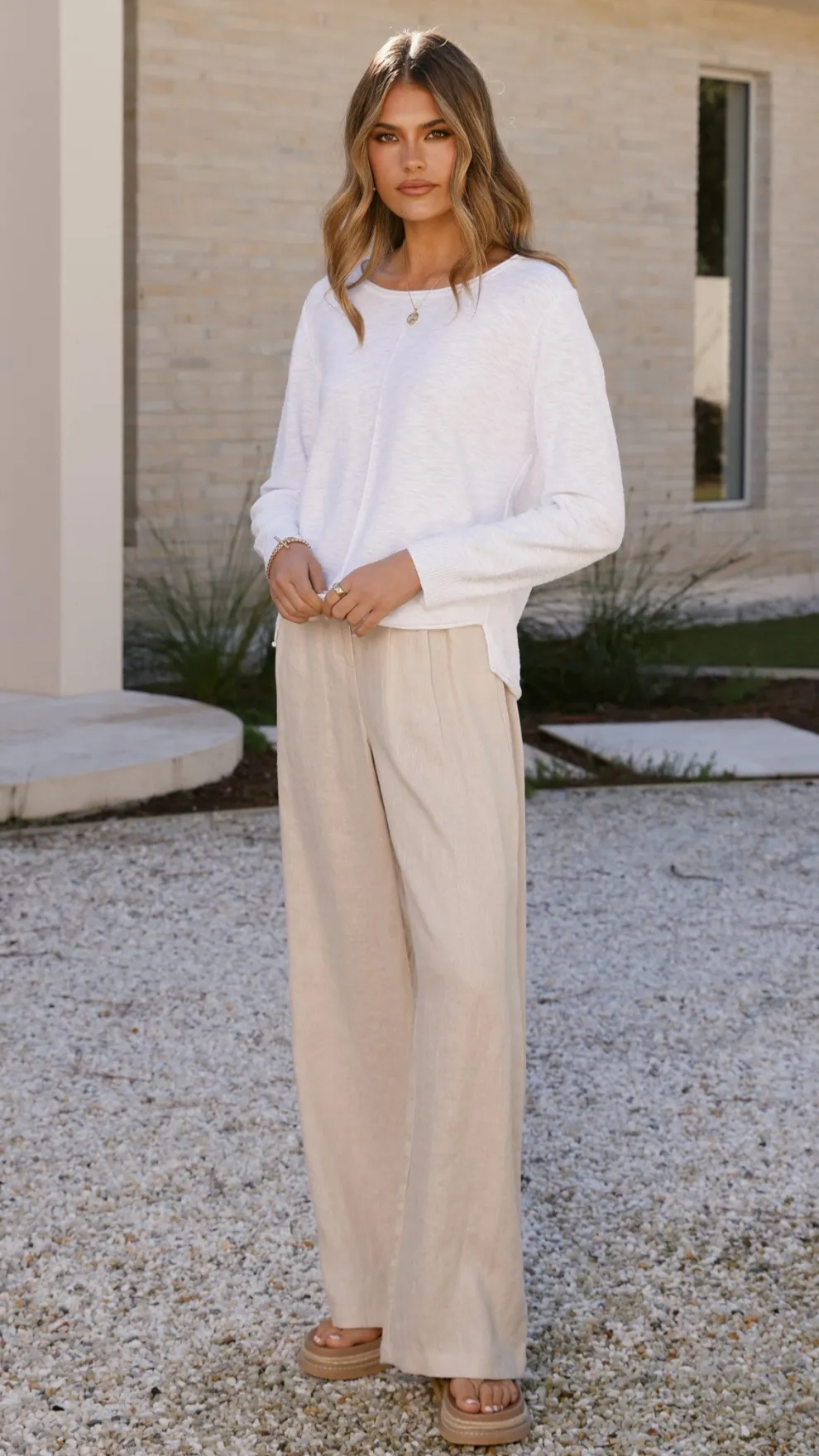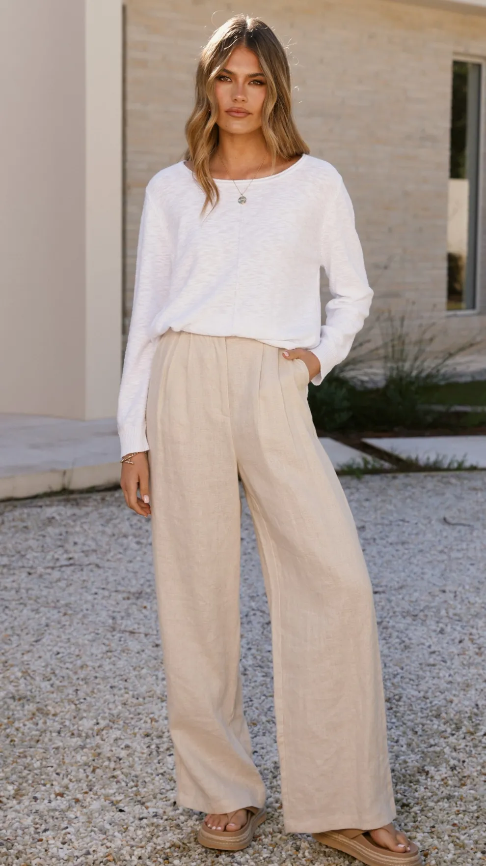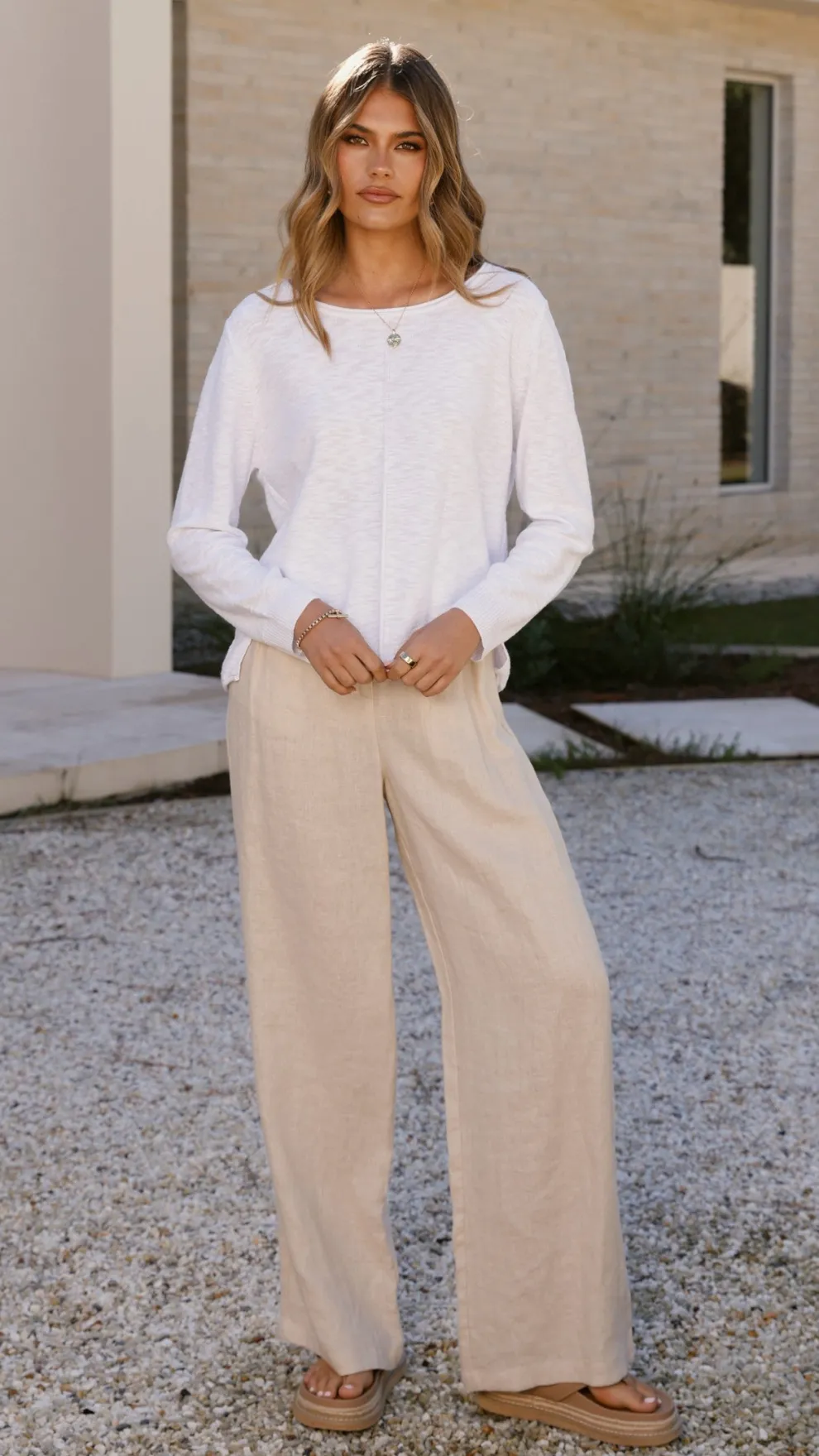 Get the look! Aila Thong – Light Clay & Tillie Pants – Oatmeal
