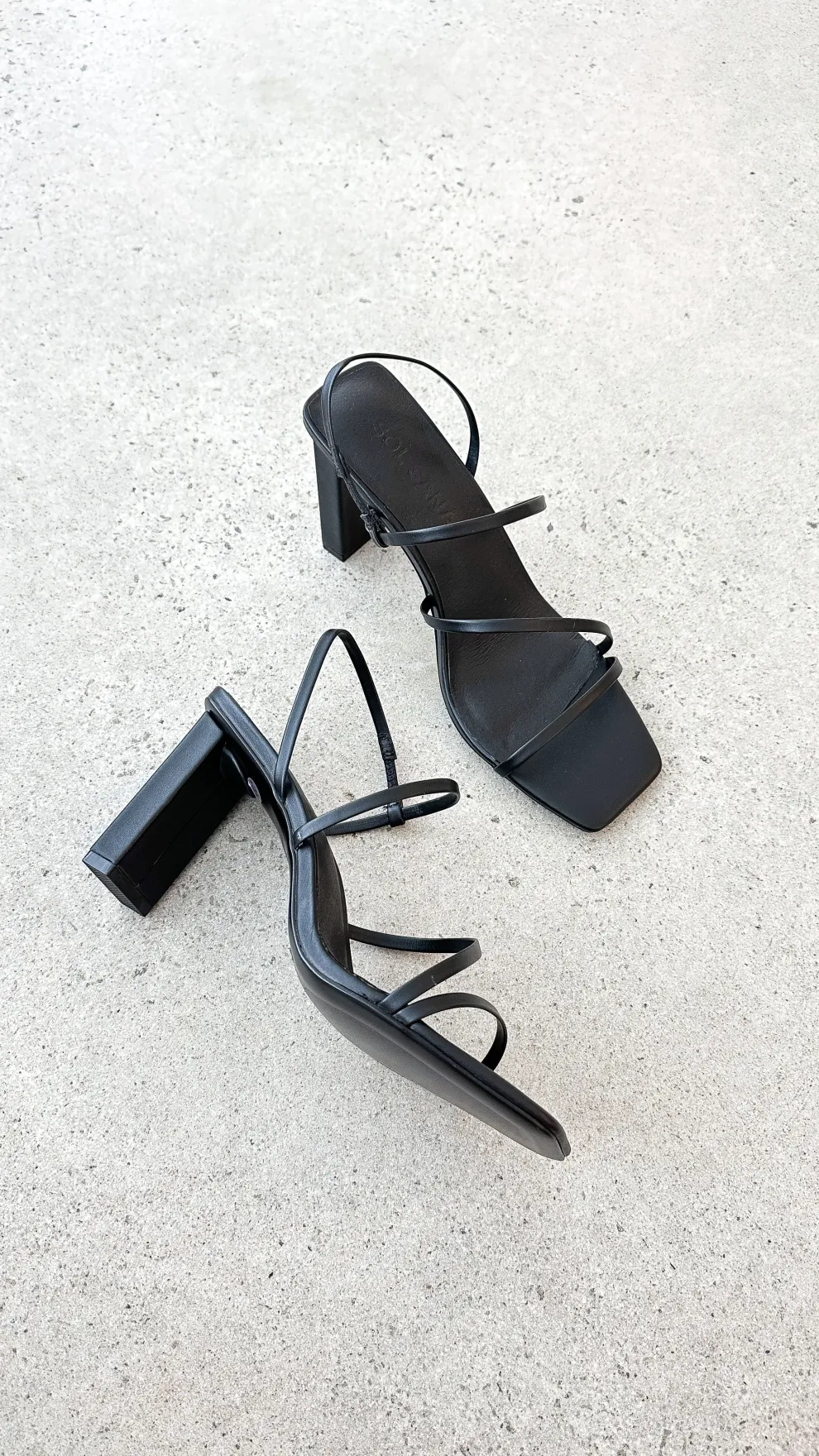 A square toe and angular modern 8cm heel brings a contemporary edge to this otherwise minimalist heel. Delicate leather straps wrap the foot in an asymmetric fashion before extending back around the heel.