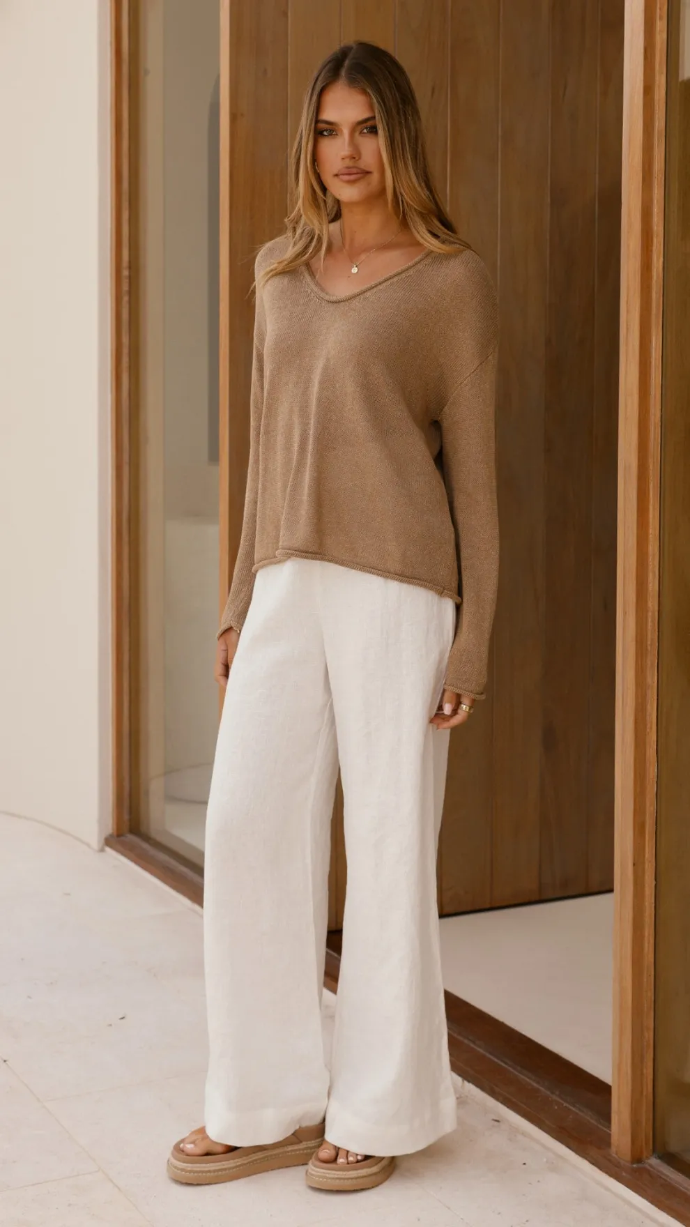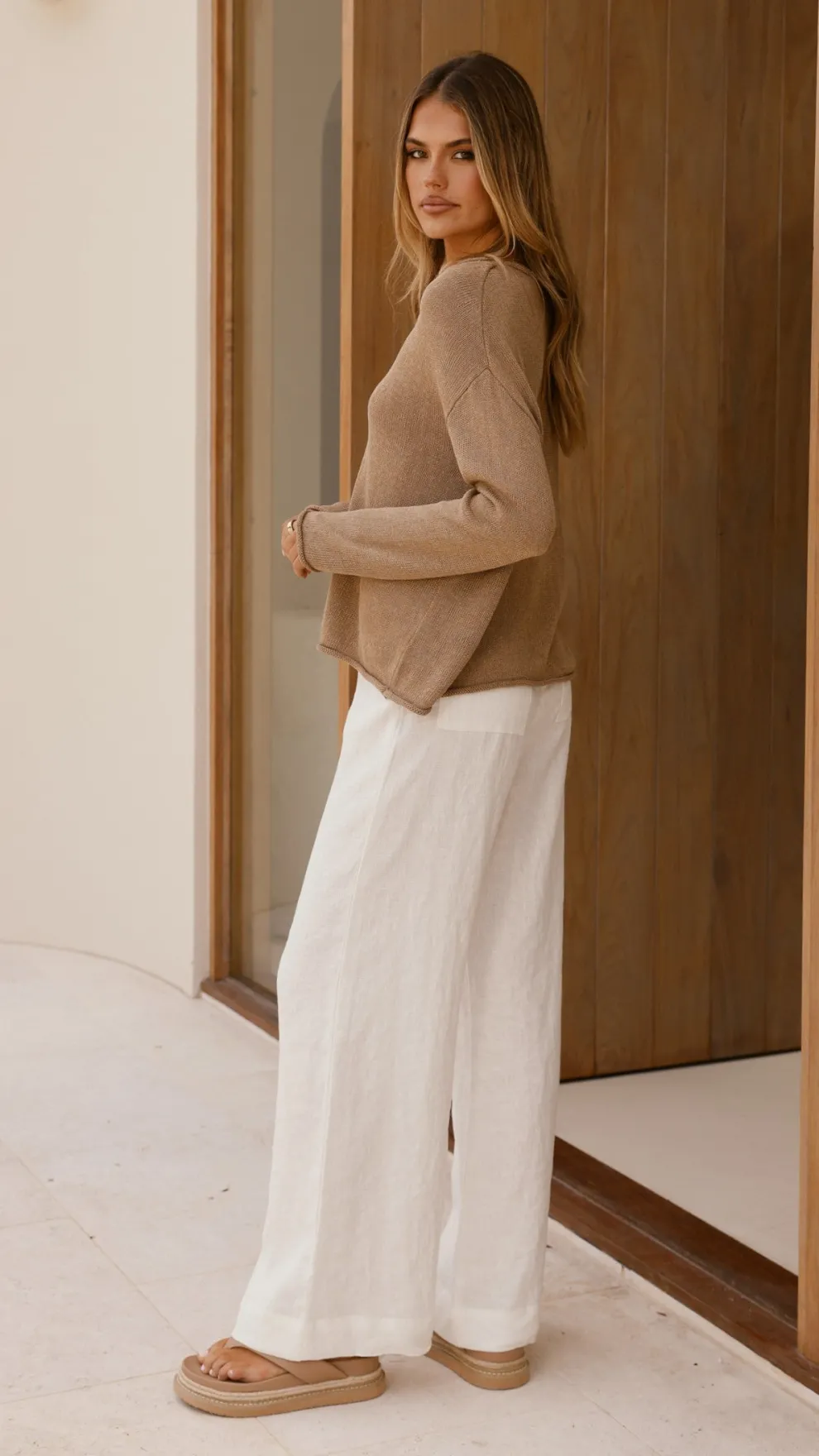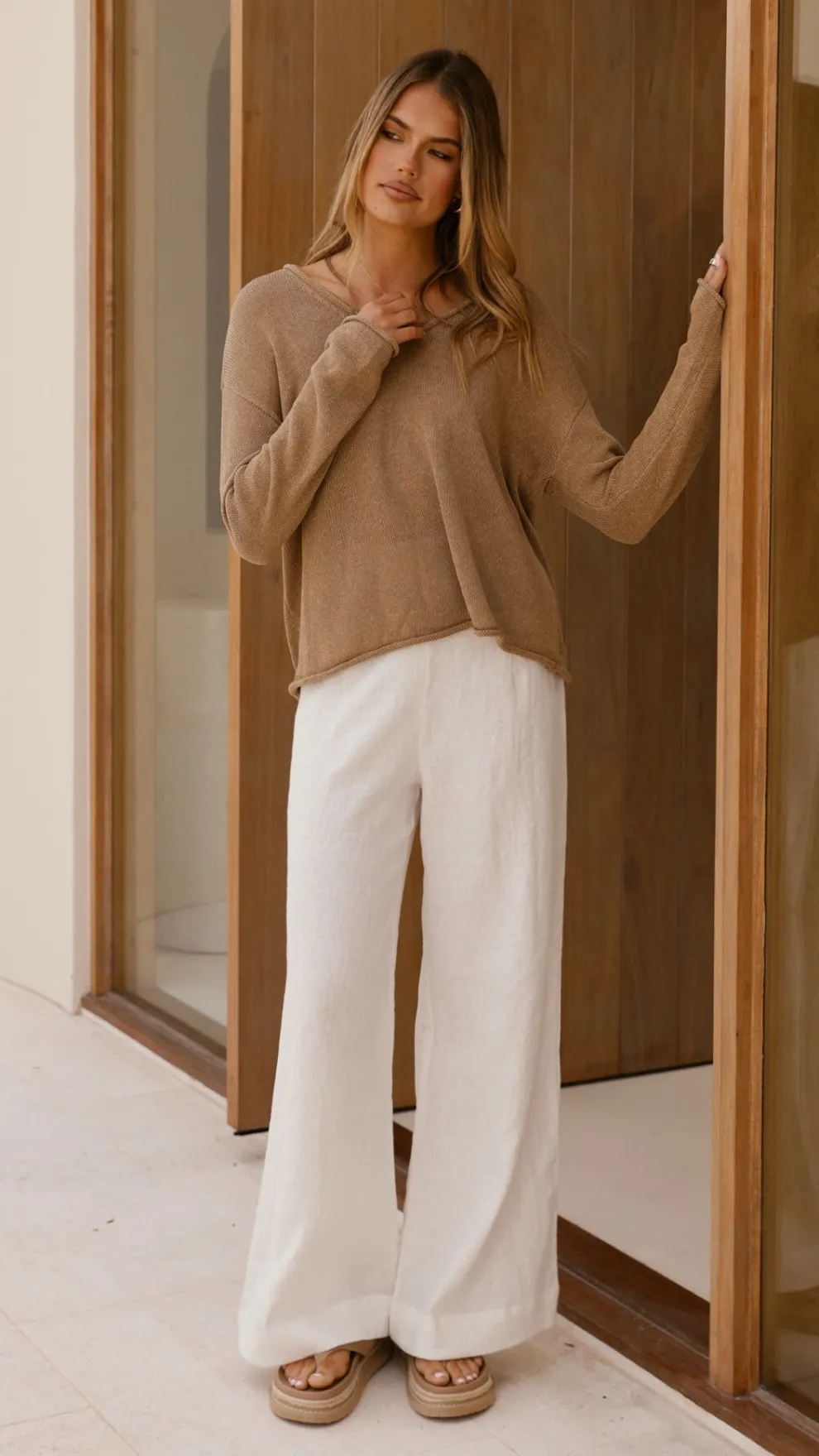 Get the look! Imogen Button Pants – Cream & Aila Thong – Light Clay