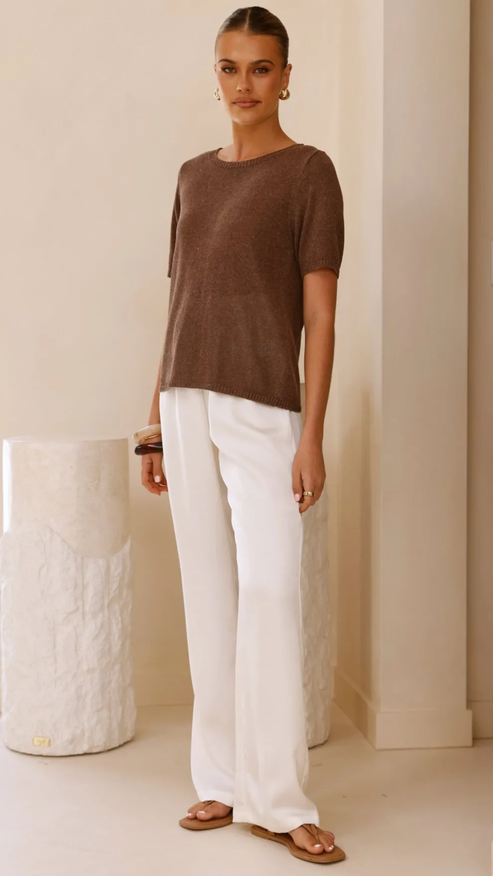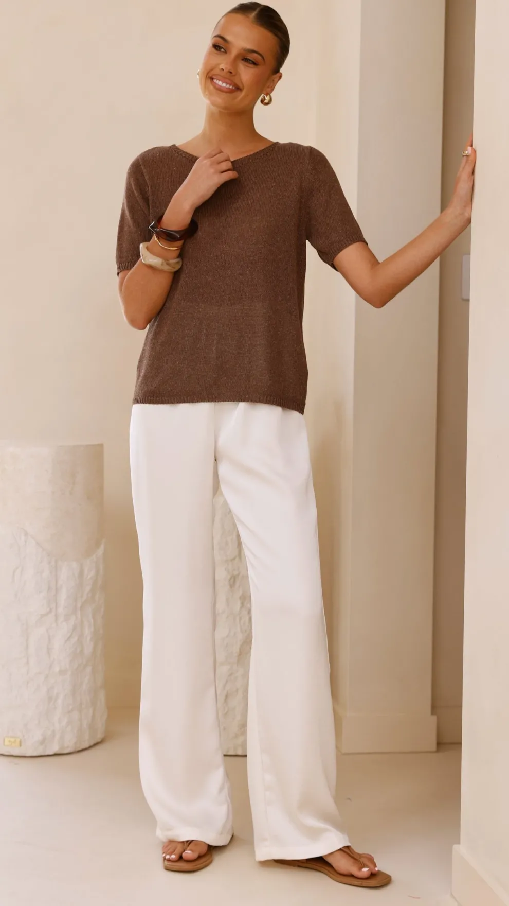 Get the look! Yaelle Sandals – Teak &Brylee Pants – Cream
