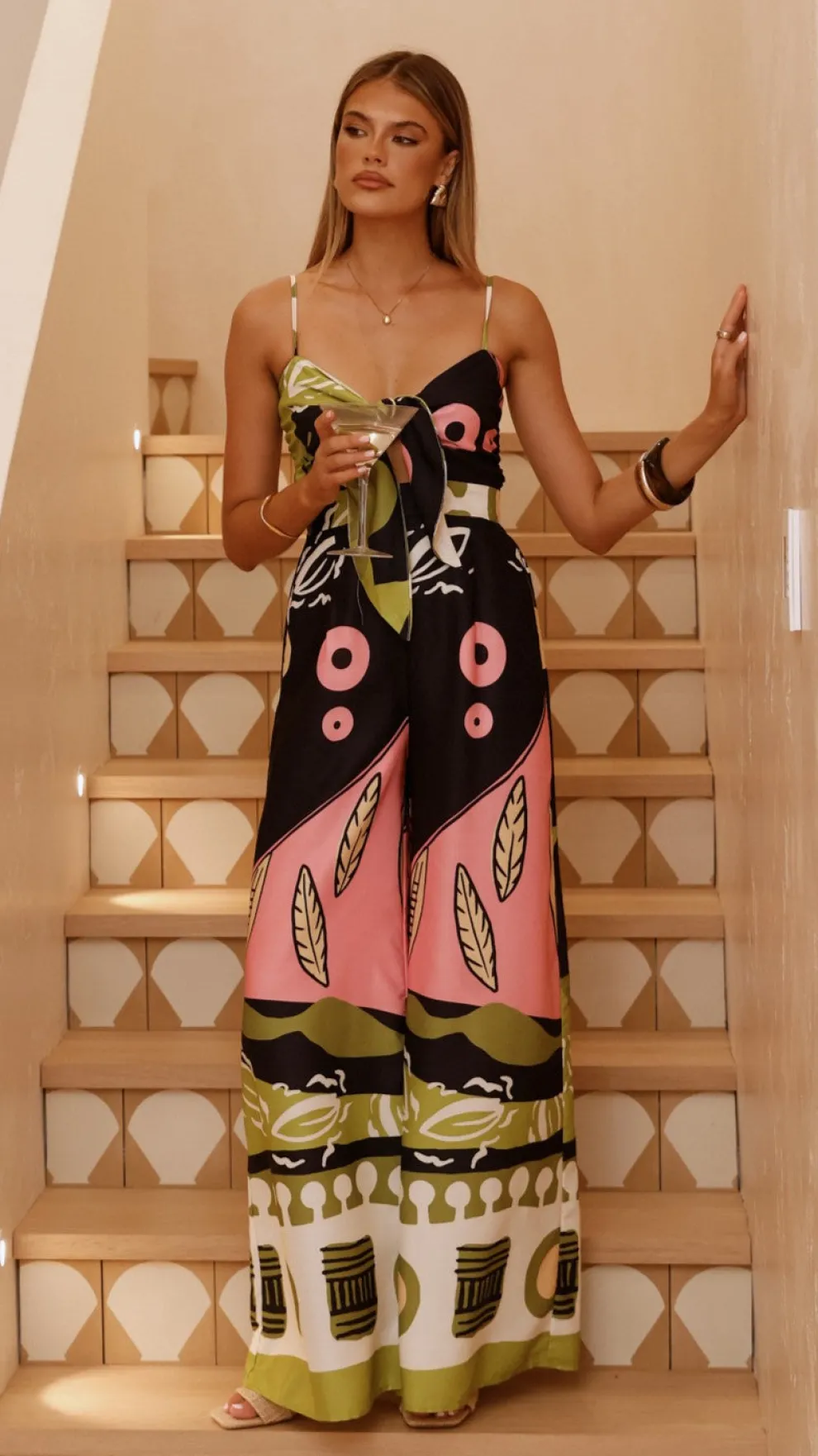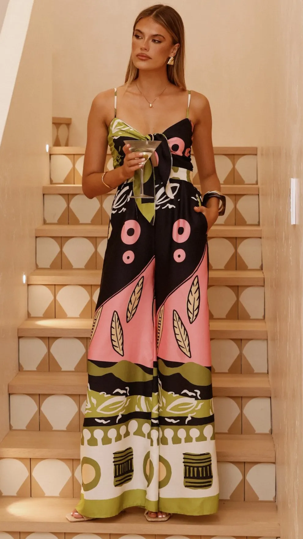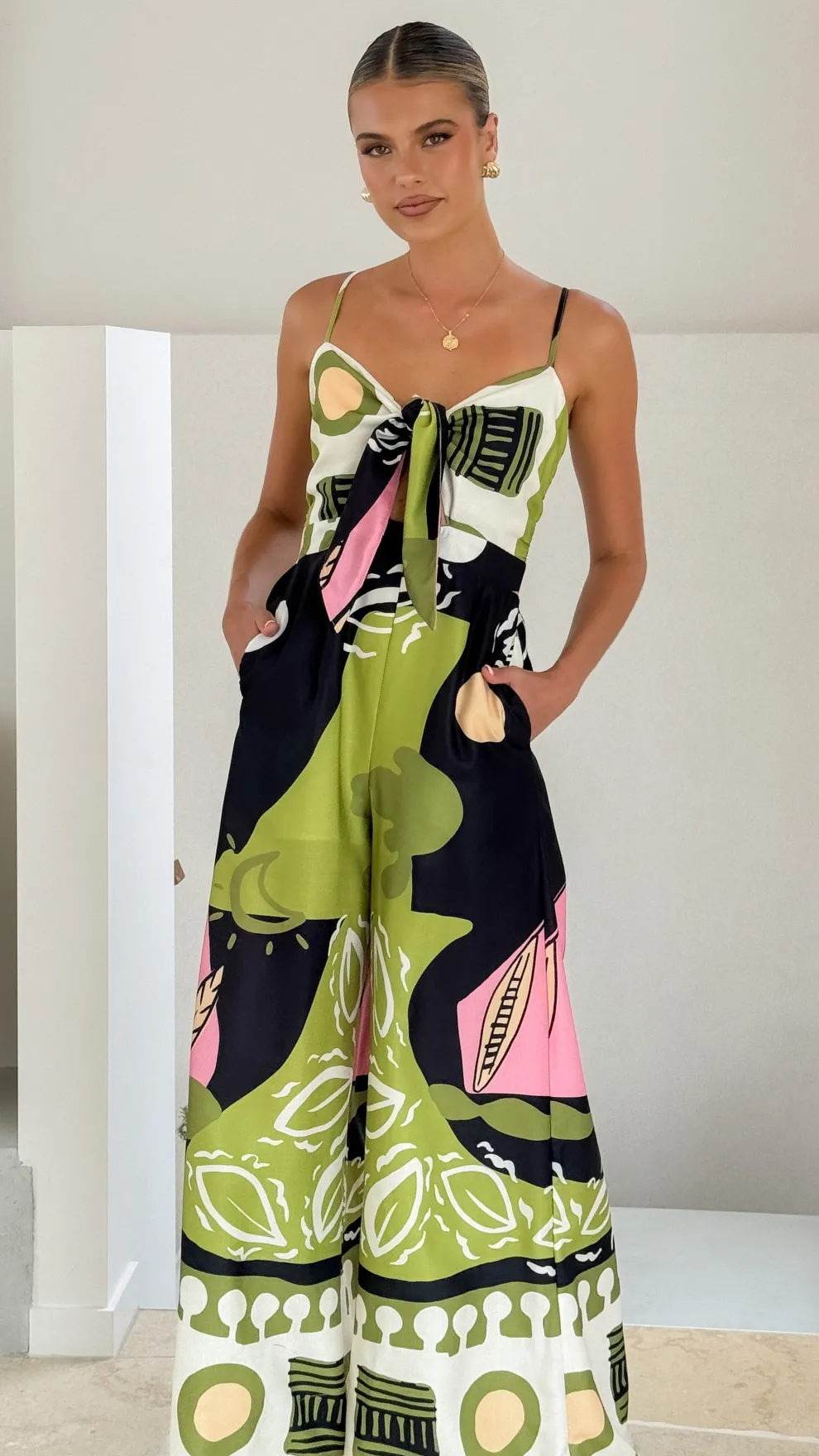 Featuring a tie-front detail, this jumpsuit includes a discreet back zipper and a flowing wide-leg silhouette. The shoulder straps can be adjusted for a perfect fit, complemented by a shirred panel at the back for added comfort and style.