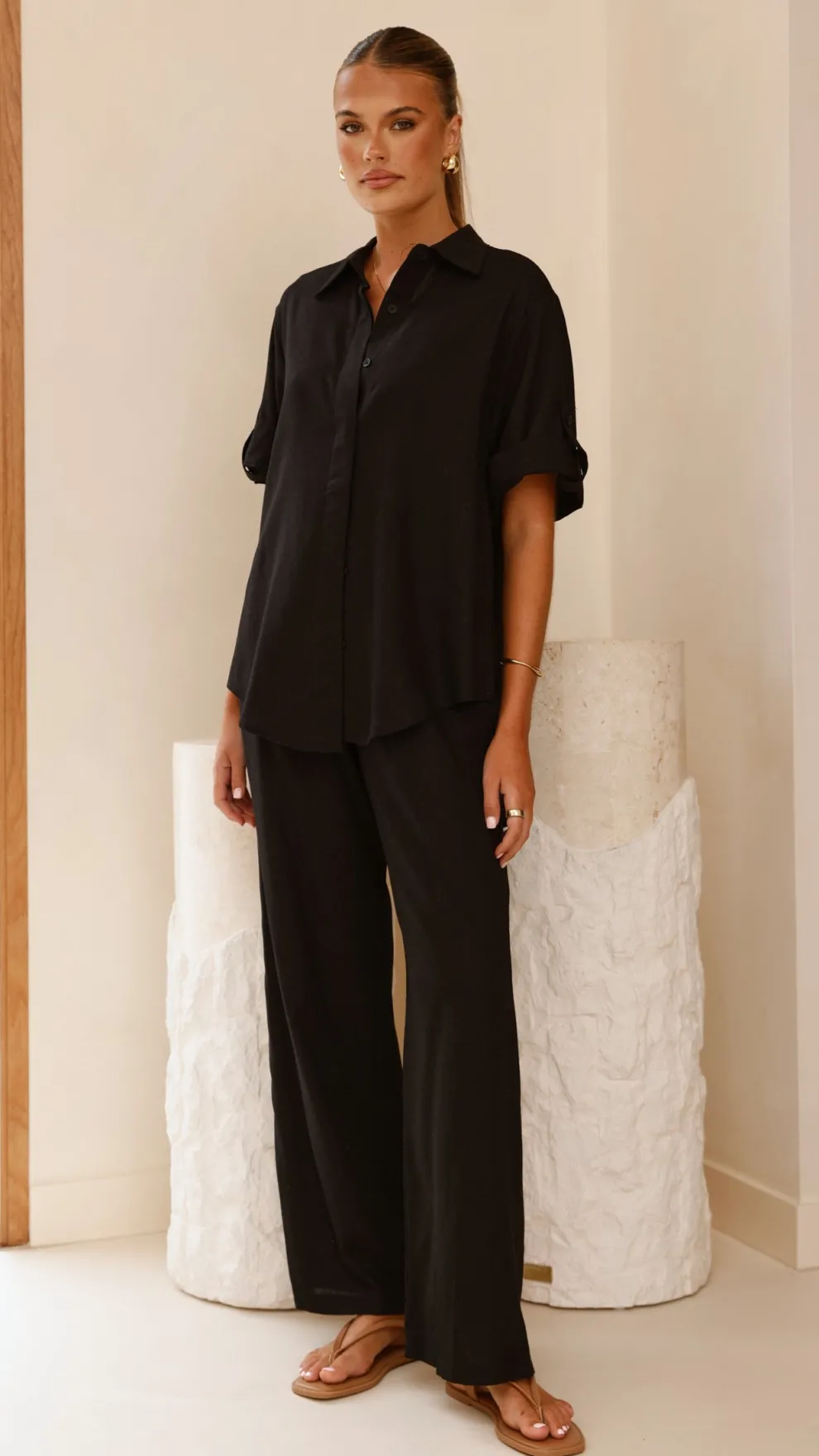 Get the look! Vallerie Button Up Shirt – Black, Charmain Top – Black & Amylee Slide – Black