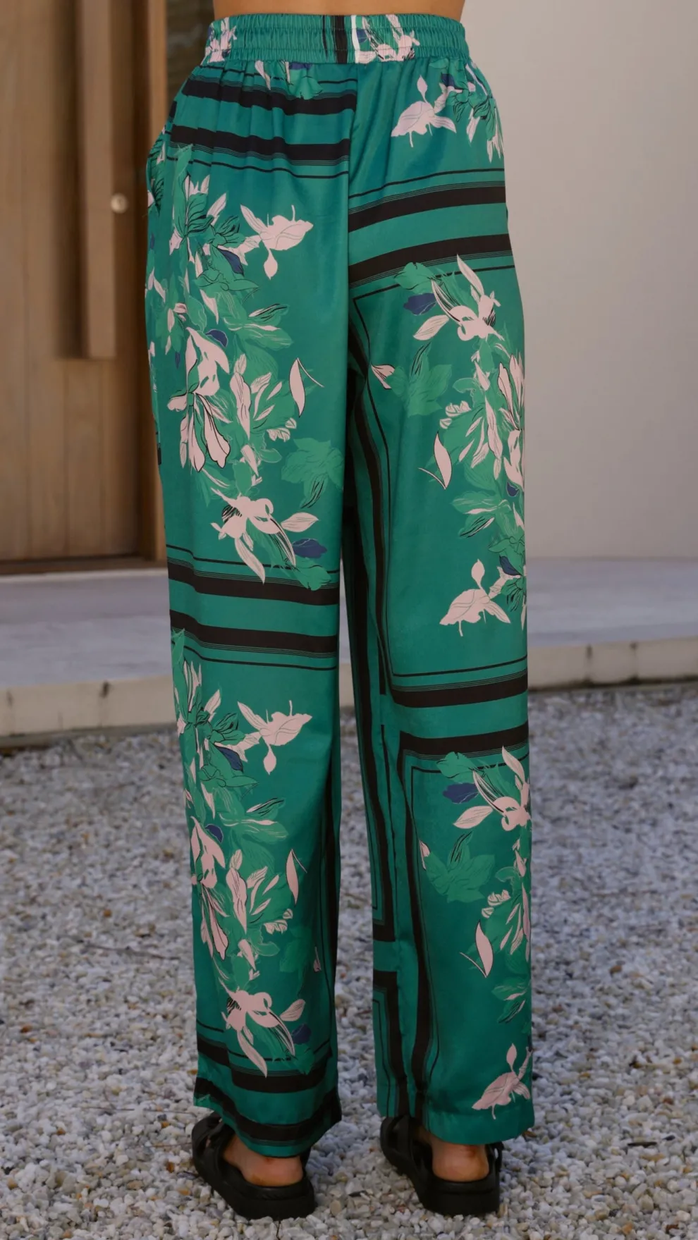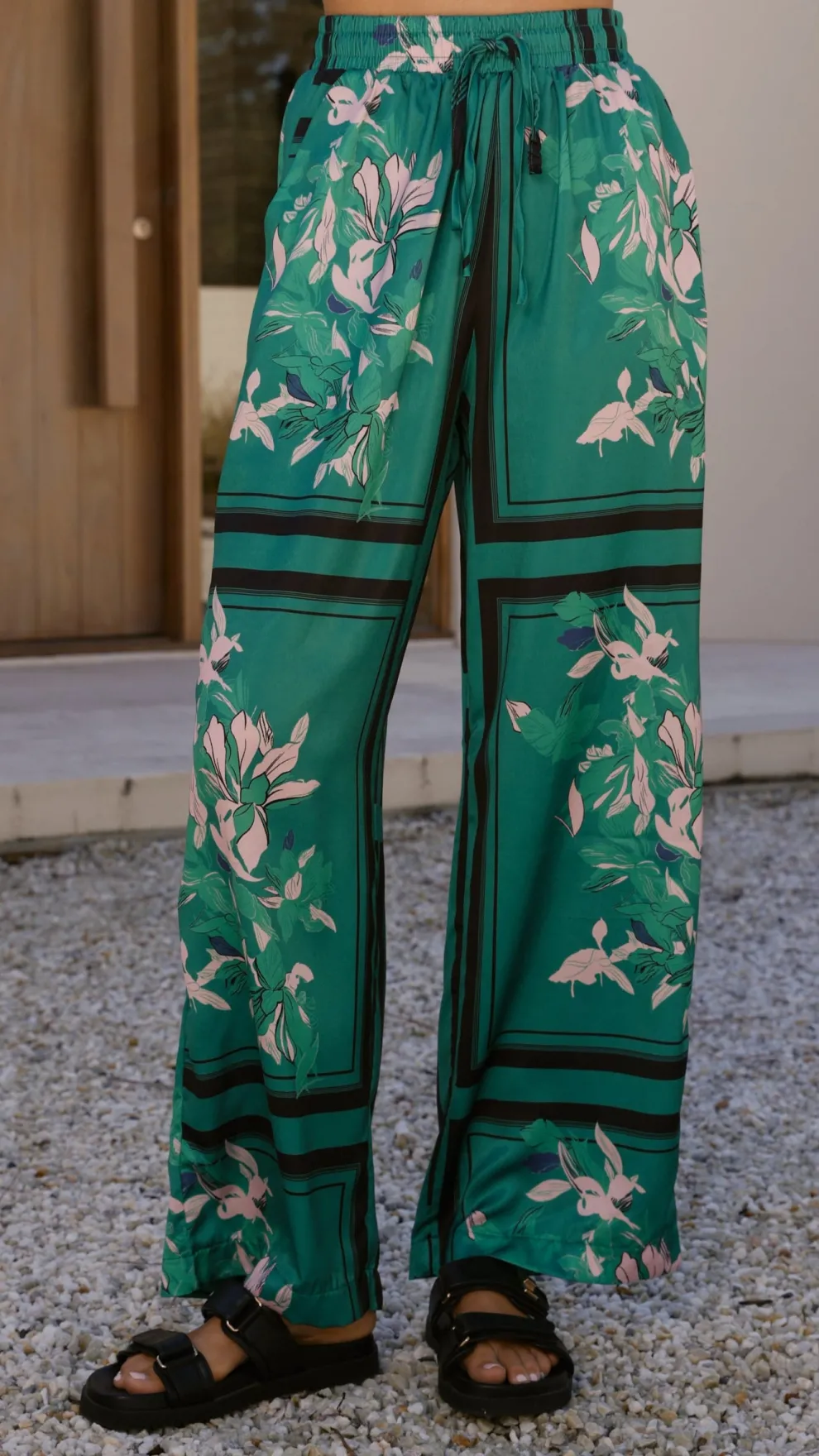 Get the look! Vallerie Button Up Shirt – Green/Pink Print & Zetland Slide – Black