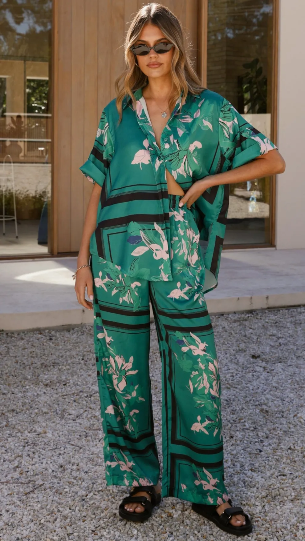 Get the look! Valene Pants – Green/Pink Print& Zetland Slide – Black