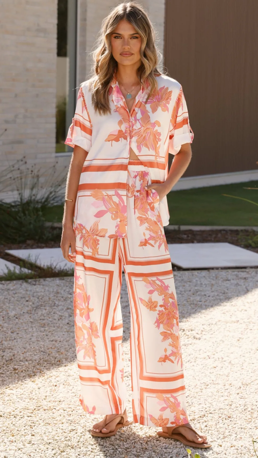 Get the look! Valene Pants – Orange/White Print & Yaelle Sandals – Teak