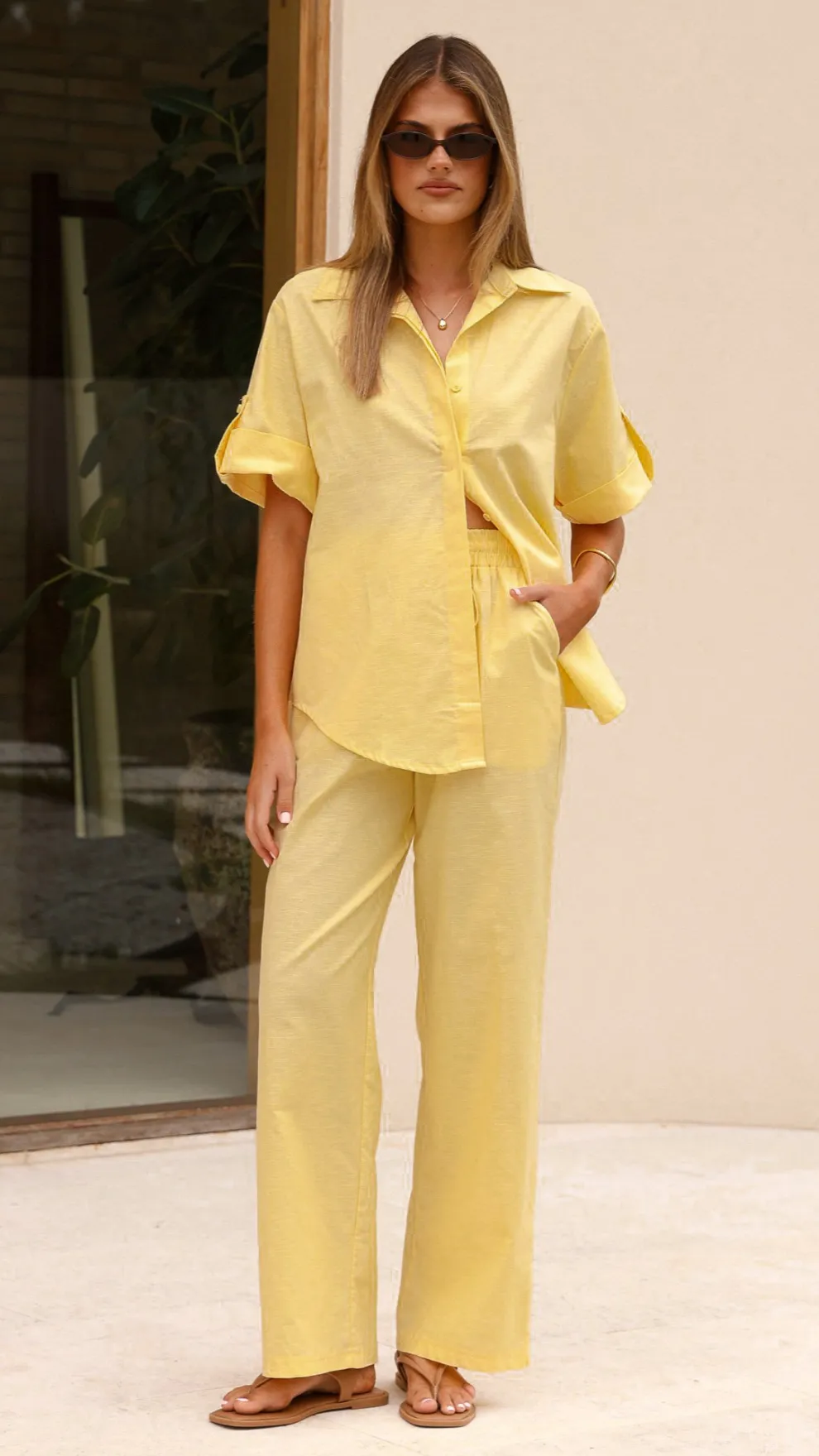 Get the look! Valene Pants – Yellow & Yaelle Sandals – Teak