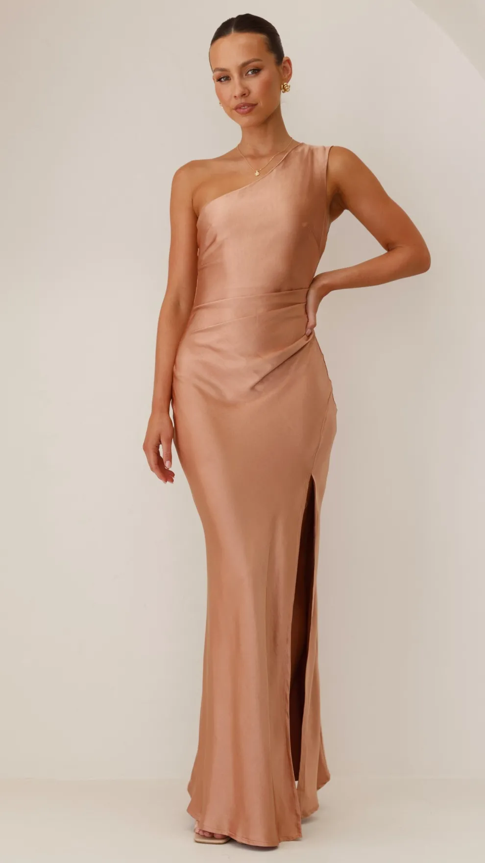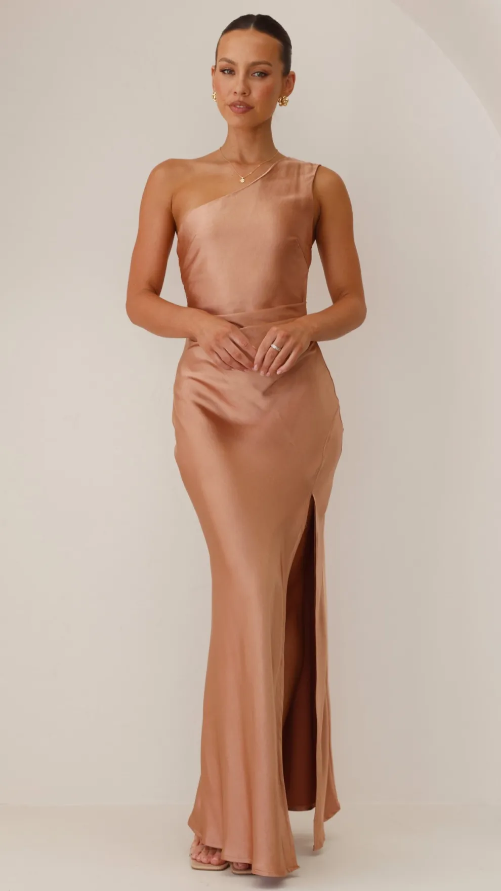 Crafted with elegance in mind, the Victoria Maxi Dress will elevate your style to new heights. Featuring a chic one shoulder design and a gathered waist, this dress provides both comfort and sophistication. With a knee high side leg split and invisible side zipper, this maxi length dress is perfect for any occasion.