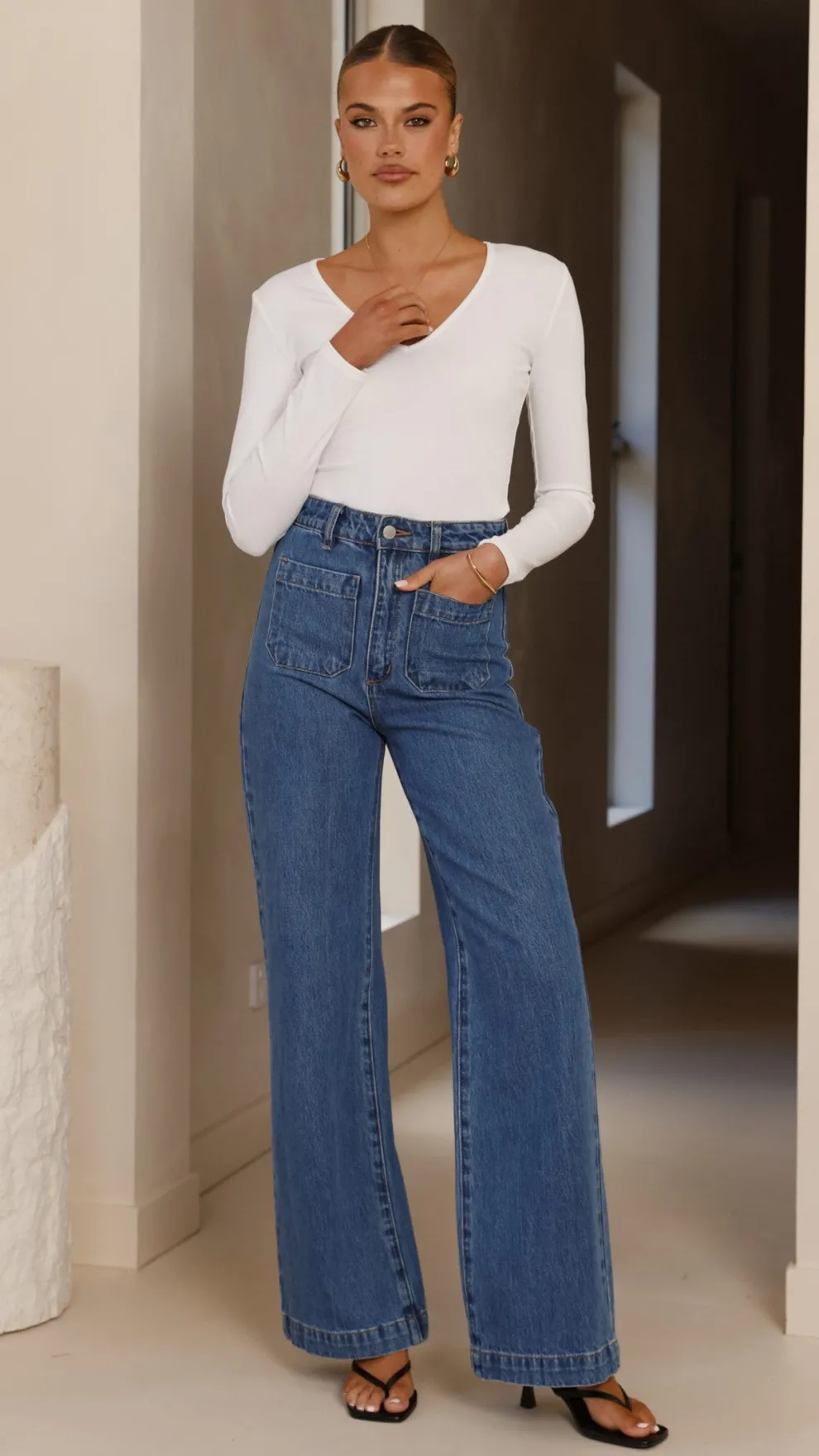 Get the look! Rollas Sailor Jean Long – Ashley Blue & Xami Heel – Black