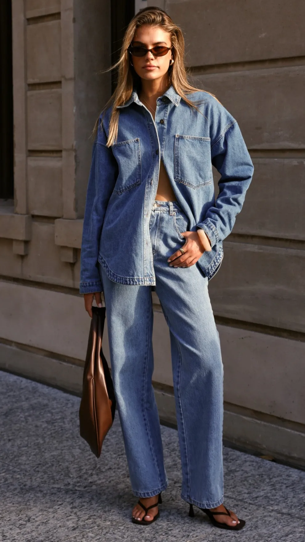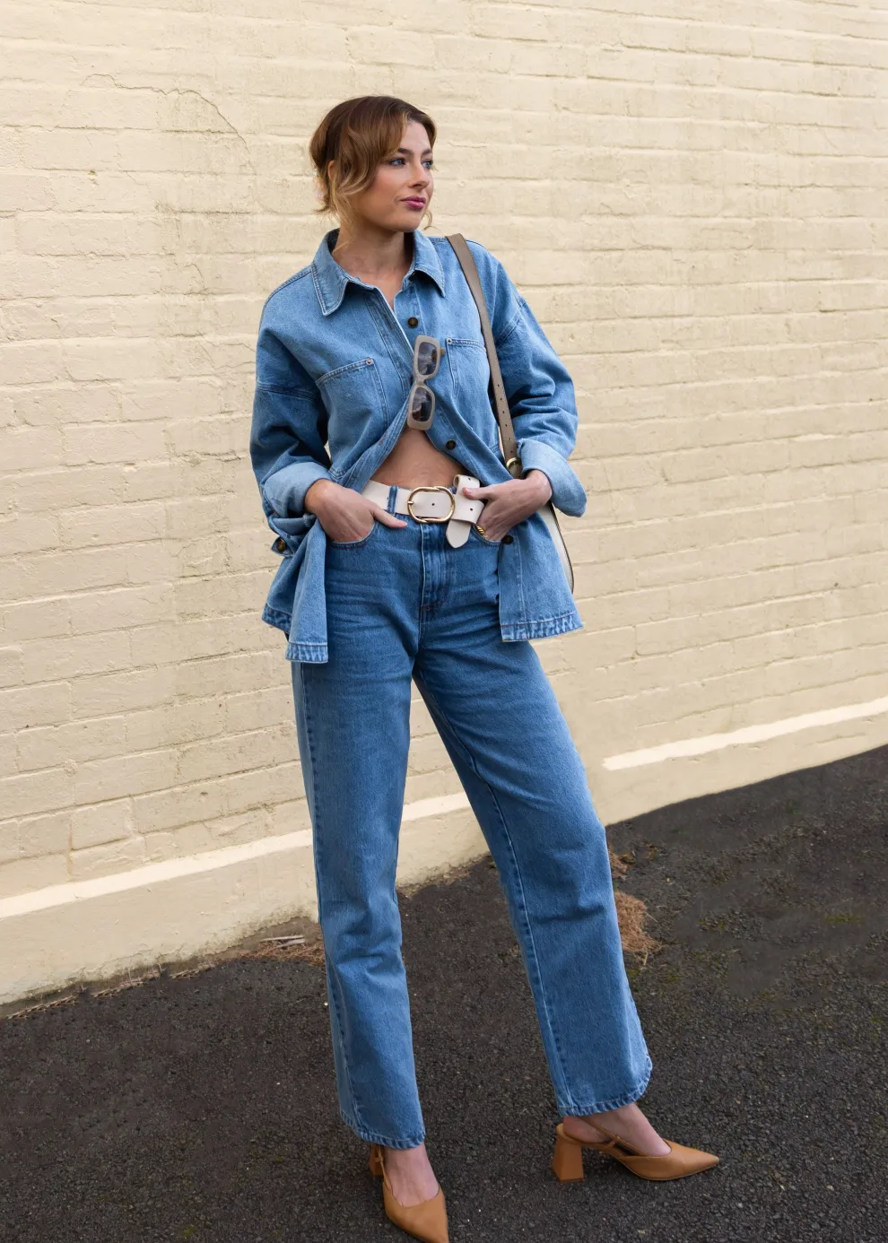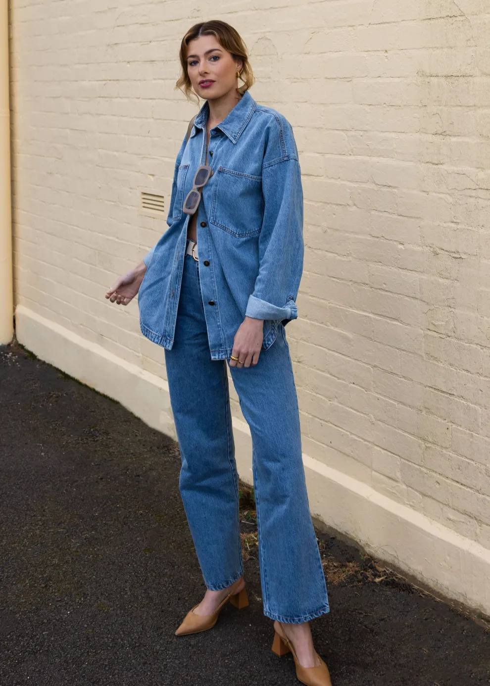 Get the look! Zaeli Denim Shirt – Mid Blue & Xami Heel – Black